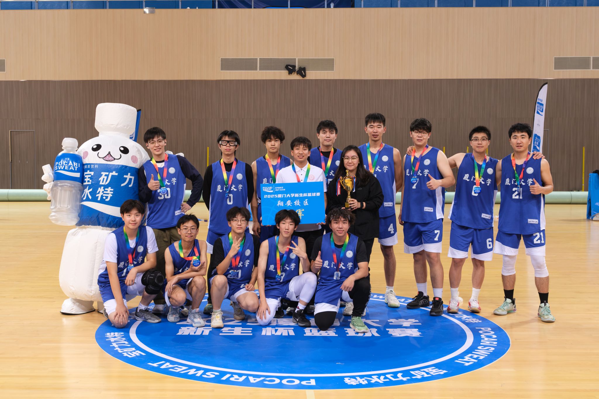 观众席上的助威声浪此起彼伏,所有观众的心跳仿佛与赛场节奏同步,每一次攻防都牵动着全场目光。终场哨响,场内迸发出热烈的欢呼与呐喊——祝贺我院男篮夺得2025年厦门大学“新生杯”篮球联赛翔安校区冠军!队员苏尚柯凭借全场卓越发挥,独得35分,荣膺本场比赛最有价值球员(MVP)称号!