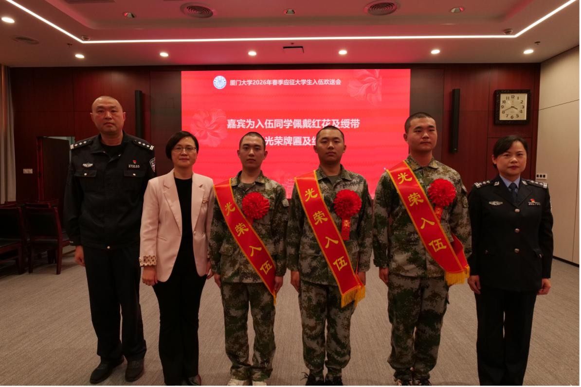 3月15日下午,厦门大学2026年春季应征大学生入伍欢送活动在颂恩楼220会议室举行。学生工作部、人民武装部部长洪春生寄语入伍同学,学生工作部、人民武装部副部长林明华介绍学校2026年春季征兵情况,宣读批准入伍学生名单。出席领导和嘉宾为入伍同学佩戴红花和绶带、颁发光荣牌匾和纪念品,表达对他们的殷切期望和美好祝福。学院党委副书记王旖旎、杨扬,辅导员肖莉君参加欢送活动,为刘嘉和同学送行。
