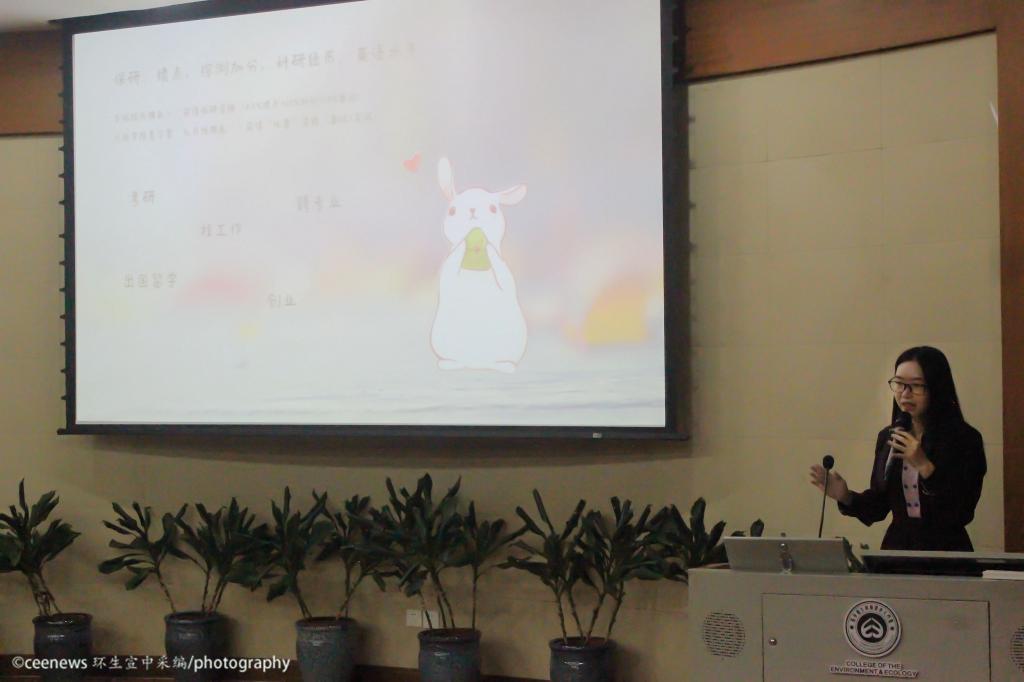 紧接着发言的是龚杜美瑾同学。她以风趣幽默的语言为同学们讲述了国奖的评定要求及保研的注意事项,同时以过来人的身份给予同学们学习上的建议。提醒同学们要把握好当下宝贵的时间,努力充实和提高自己。