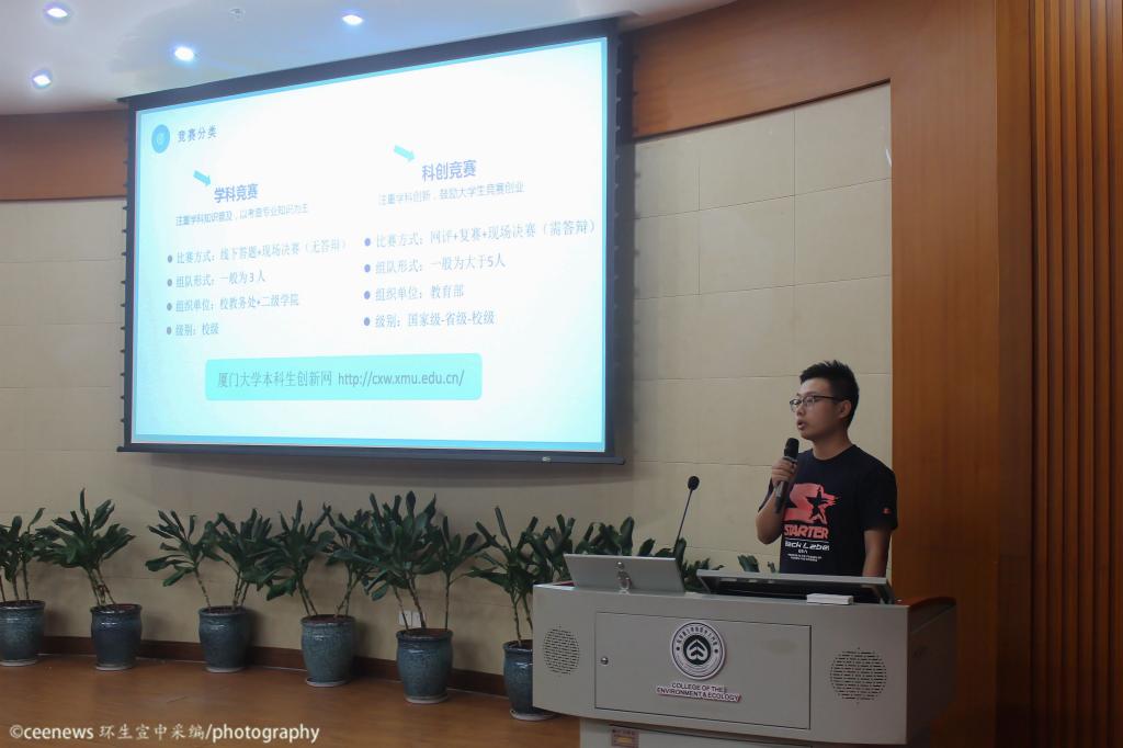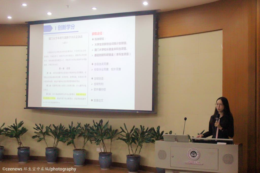 随后上台的谢丽芳同学则是为同学们带来了科创经验的分享。她先是从与同学们的学习密切相关的创新学分引入,紧接着以生动的语言为同学们介绍了大学生创新创业训练计划(下称大创)的基本信息。从大创计划的申请参加到后期科研的注意事项,帮助同学们建立了对大创的初步认识。