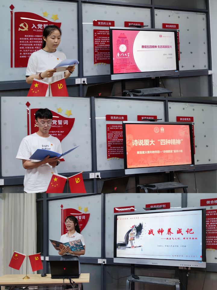 活动伊始,能源学院何娴雅同学首先为大家带来主题为“赓续五四精神 矢志民族复兴”的微党课。随后,囊萤星火青年讲师团公共卫生学院王家伟同学和环境与生态学院王思溱同学分别讲述追寻诗意里的厦大四种精神和开国大将栗裕的故事。三位同学声情并茂的演讲使得同学们深刻体会了共产党人的初心使命。
