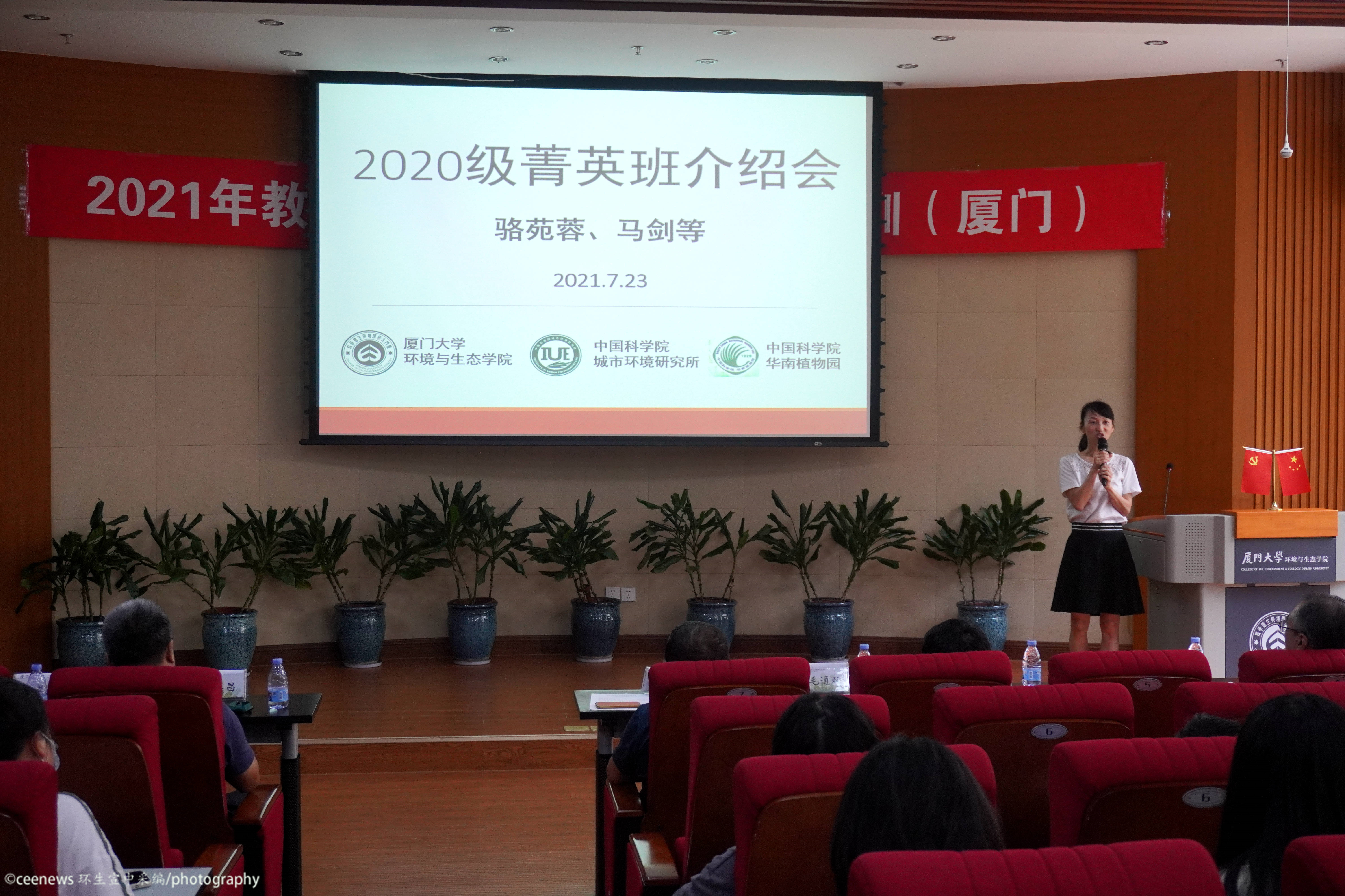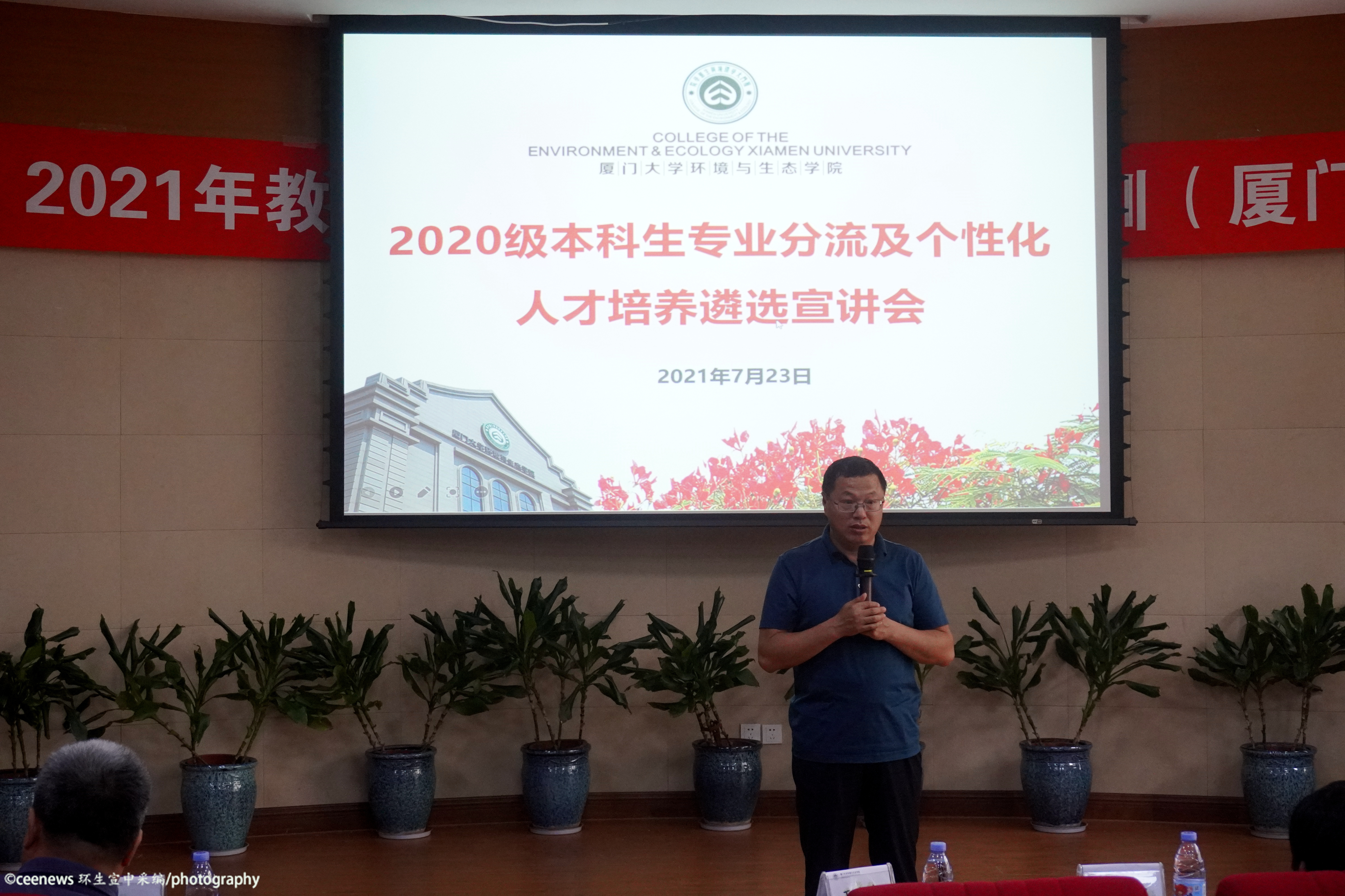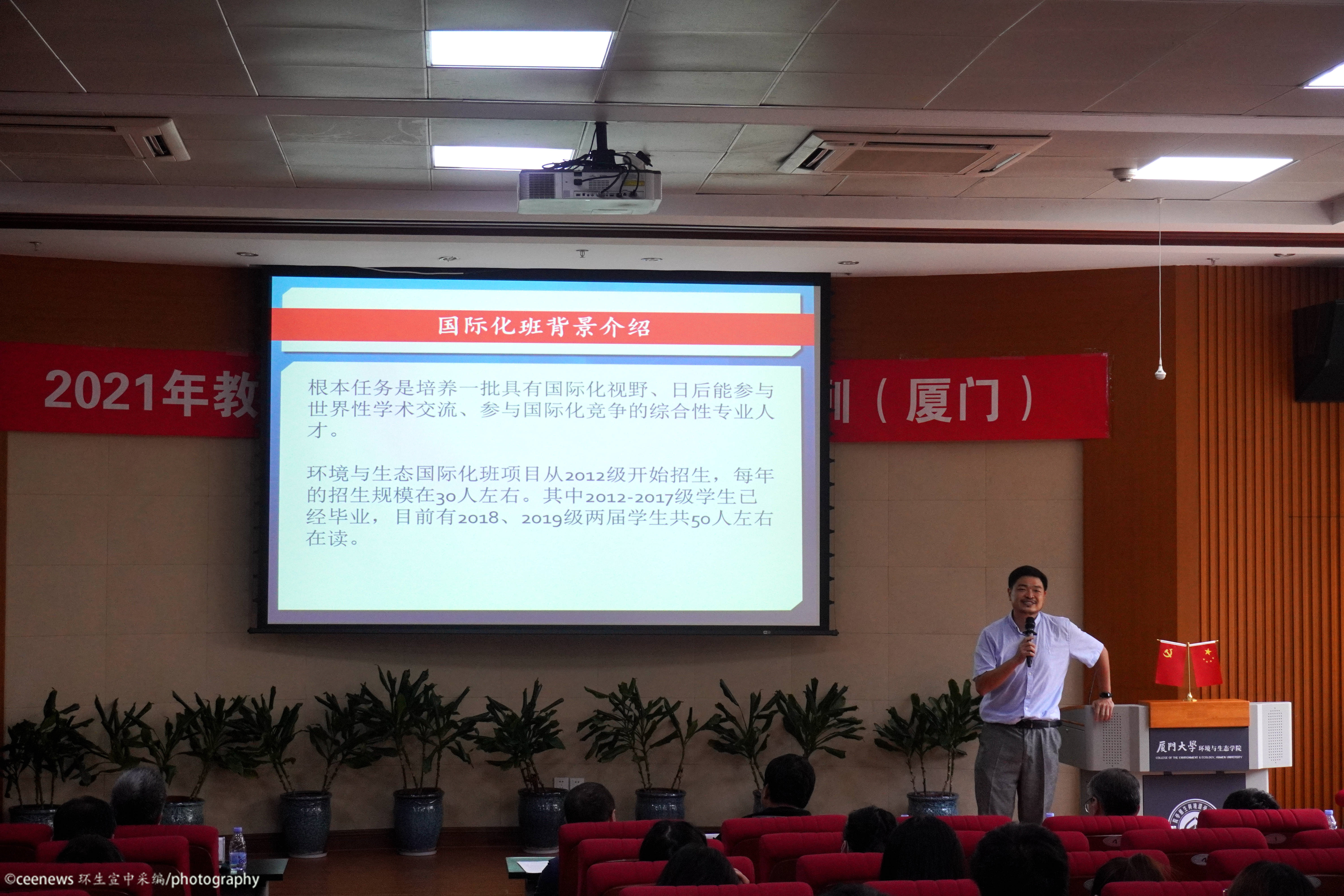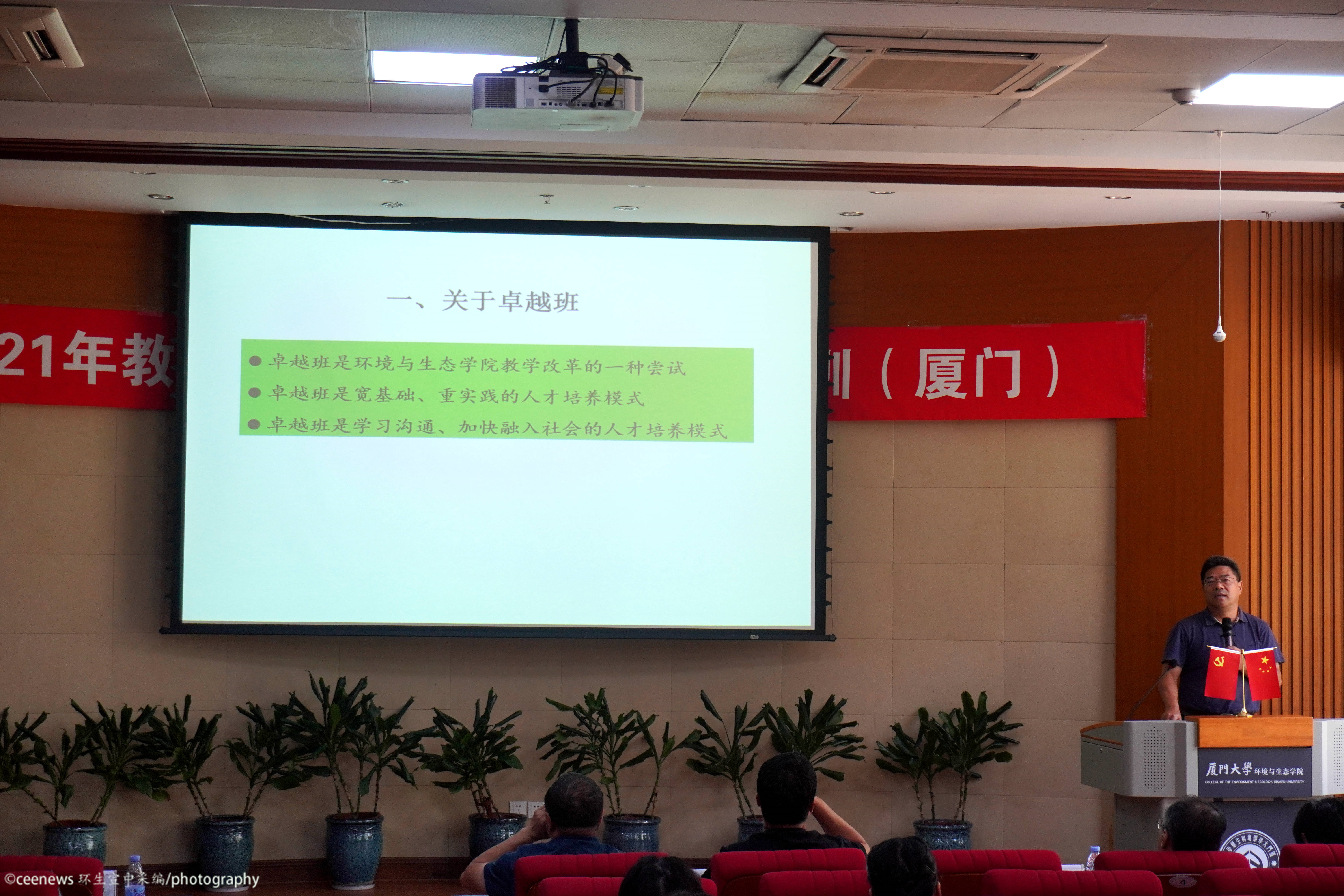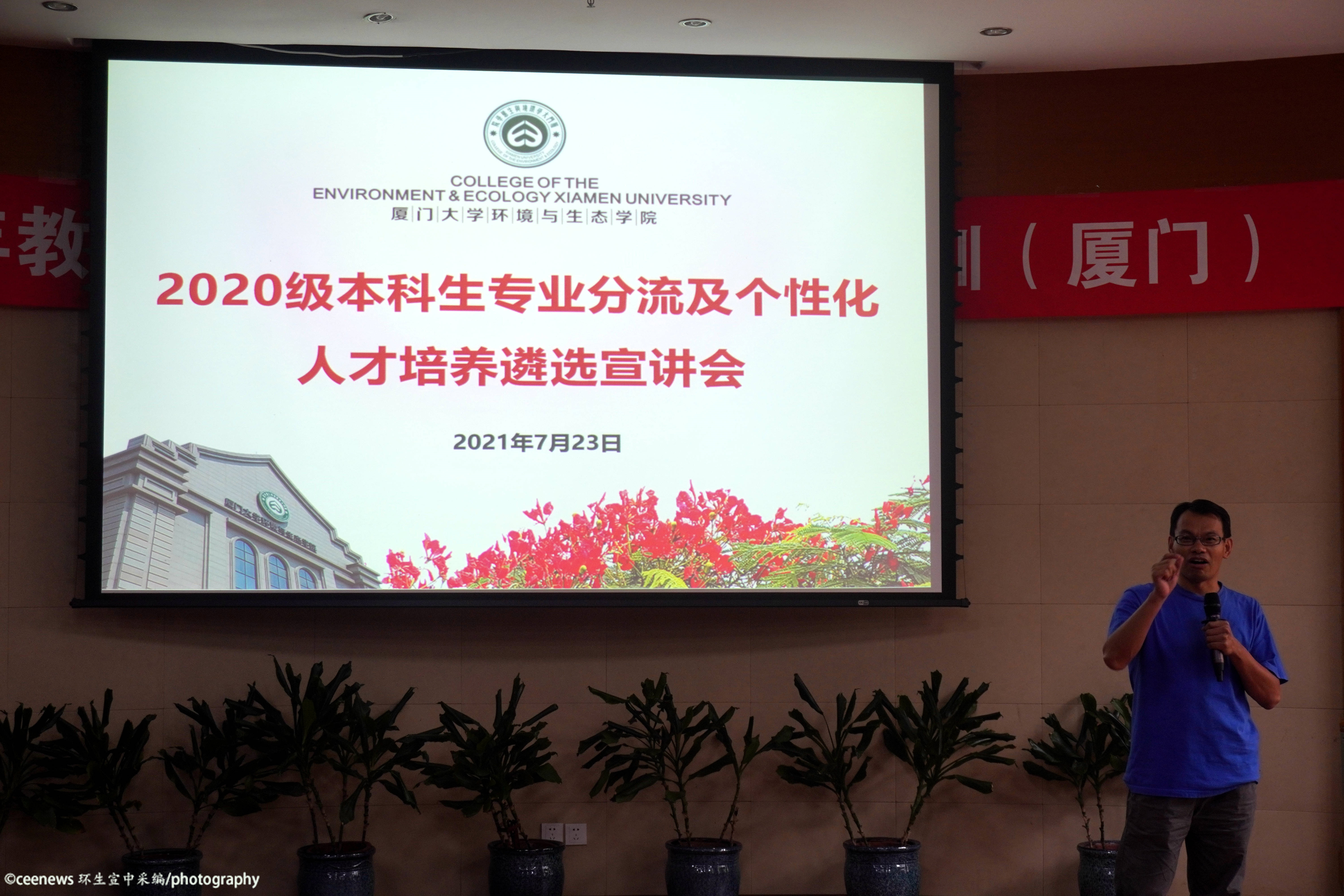 在介绍完三个专业后,进行的是个性化培养项目的介绍。菁英班培养项目由骆苑蓉老师主讲。菁英班是自2014年起和中科院城市环境研究所及华南植物园联合成立的培养项目。独特的双导师培养模式和每年至少一个月的科研实践吸引了不少同学的目光。在简单介绍了参与项目的导师代表后,骆老师以“为什么、做什么、能收获什么”为主线,声情并茂地为同学们展示了往届菁英班同学的日常生活。最后她还贴心地强调了进入菁英班的各项要求和进入后的收获等重点事项。国际化班培养项目由沈英嘉老师主讲。他先是指出同学们对国际化班一直以来的片面看法并进行详细解释。作为最早开始的培养项目,国际化班正向着更高的目标改革,以便更好地与国际接轨。卓越班培养项目由杨盛昌老师主讲。他从卓越班同学的培养要求切入,以实践活动和实践场地作为宣讲重点,从多方面、多角度介绍了未来的学习调研和实践生活。