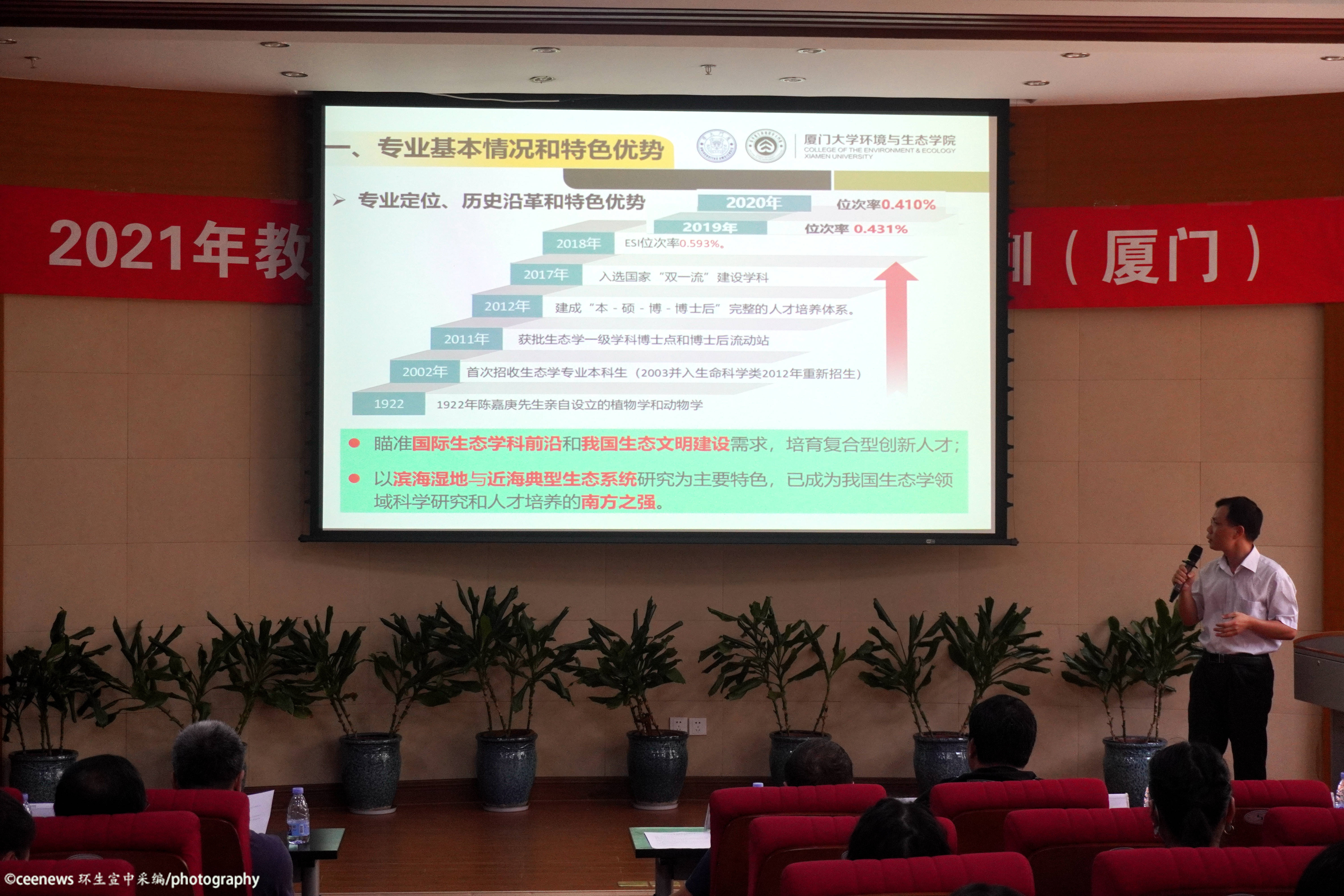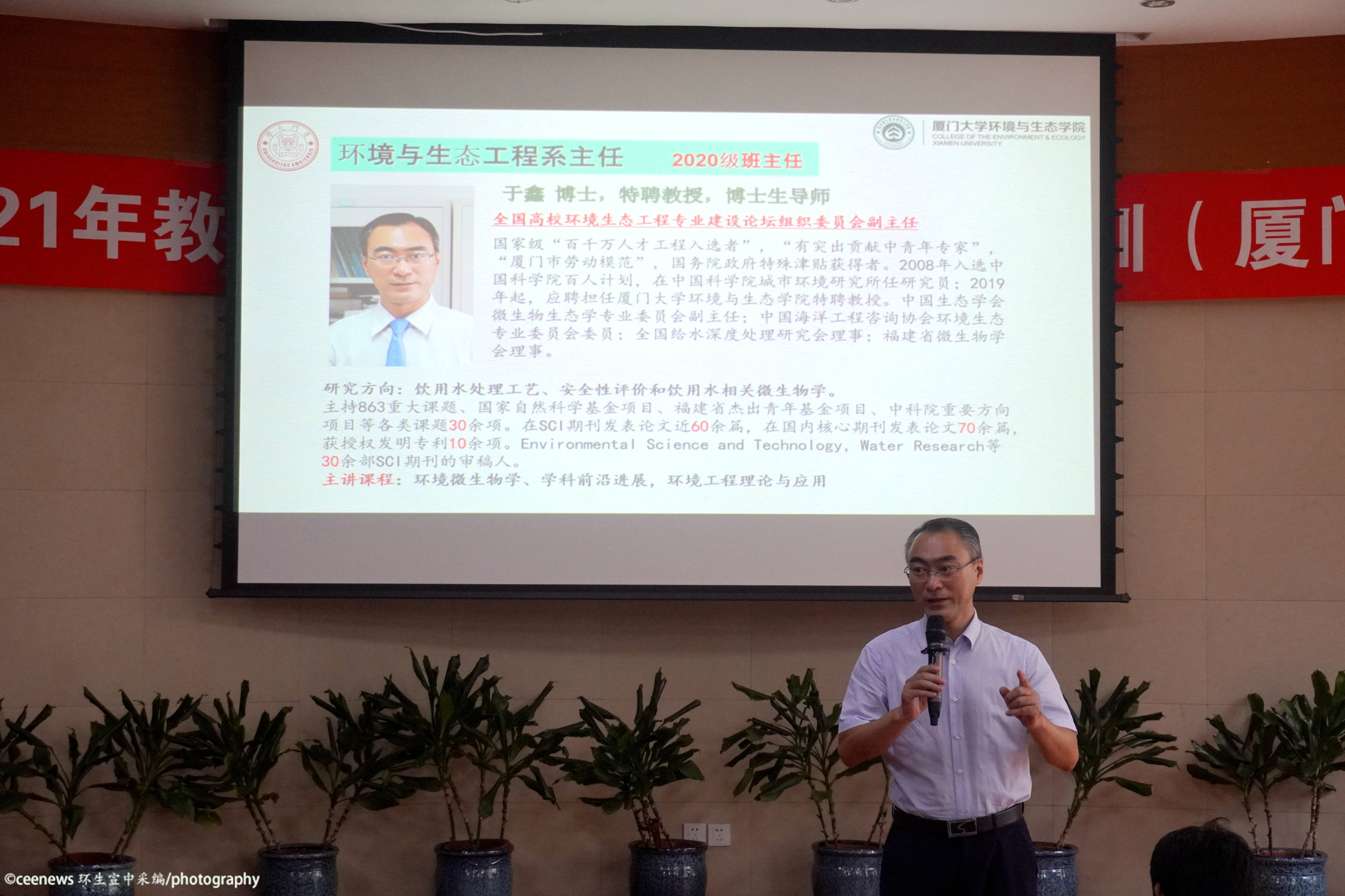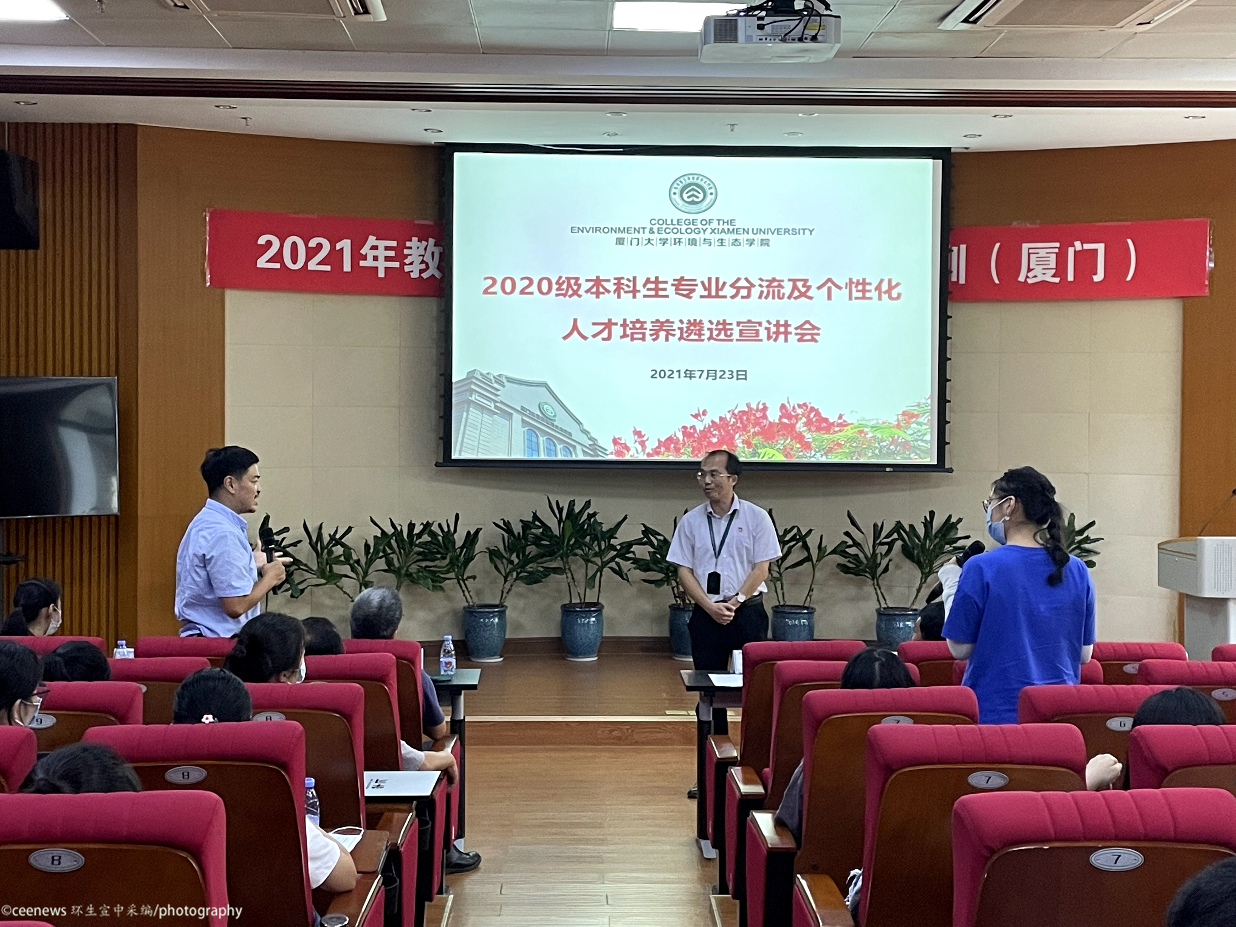 欧阳通和于鑫老师介绍环境生态工程专业。欧阳通老师先是从该专业的起源讲起,简单阐述了专业的发展历程和取得的成就,专业特色在于生态、环境和工程多层次的交叉互融,这一特色在其培养目标和课程体系的设置上也有所体现。与此同时,我院与多个校外机构的合作也为实践活动提供了支持。于鑫老师随后上台补充,针对同学们最困惑的三个问题做出了详尽的解答。