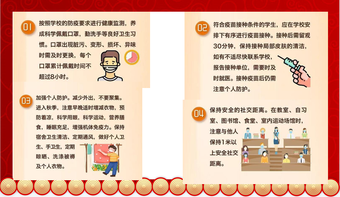 四、及时报告相关信息。目前已从疫情发生地返回,或假期接触过来自疫情发生地人员的教师、家长或学生,应密切关注自己的健康状况,按要求进行隔离观察两周(14 天),并主动向辅导员及所在街道社区报告情况。