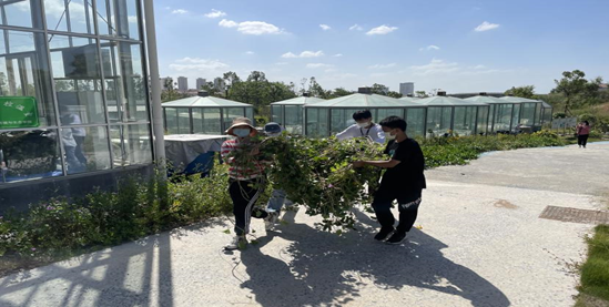 在滨海湿地温室群基地。研究生学长学姐介绍基地环境,并教授如何除掉周边的藤蔓并有效用来施肥;并且带领本科新生一起劳动。