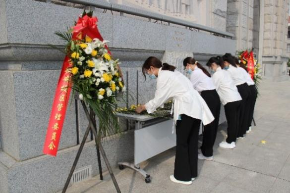 十名学生代表穿戴整齐、着装统一、神情肃立,在浮雕前行注目礼并默哀一分钟。随后,学生代表依次缓步上前向烈士敬献鲜花,仔细整理浮雕两侧花篮上的缎带,表达对革命先烈深刻的敬意和殷切的哀思。