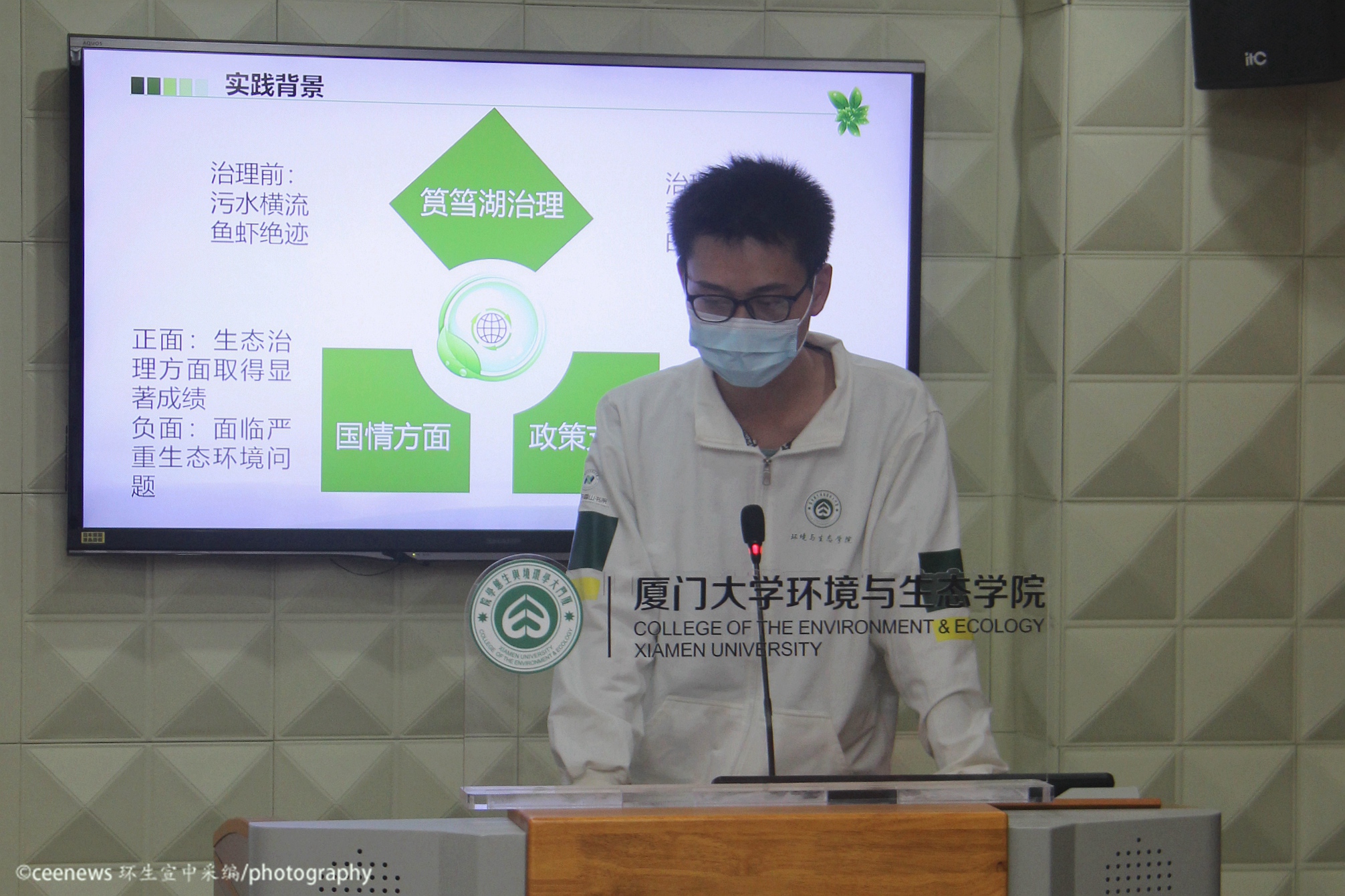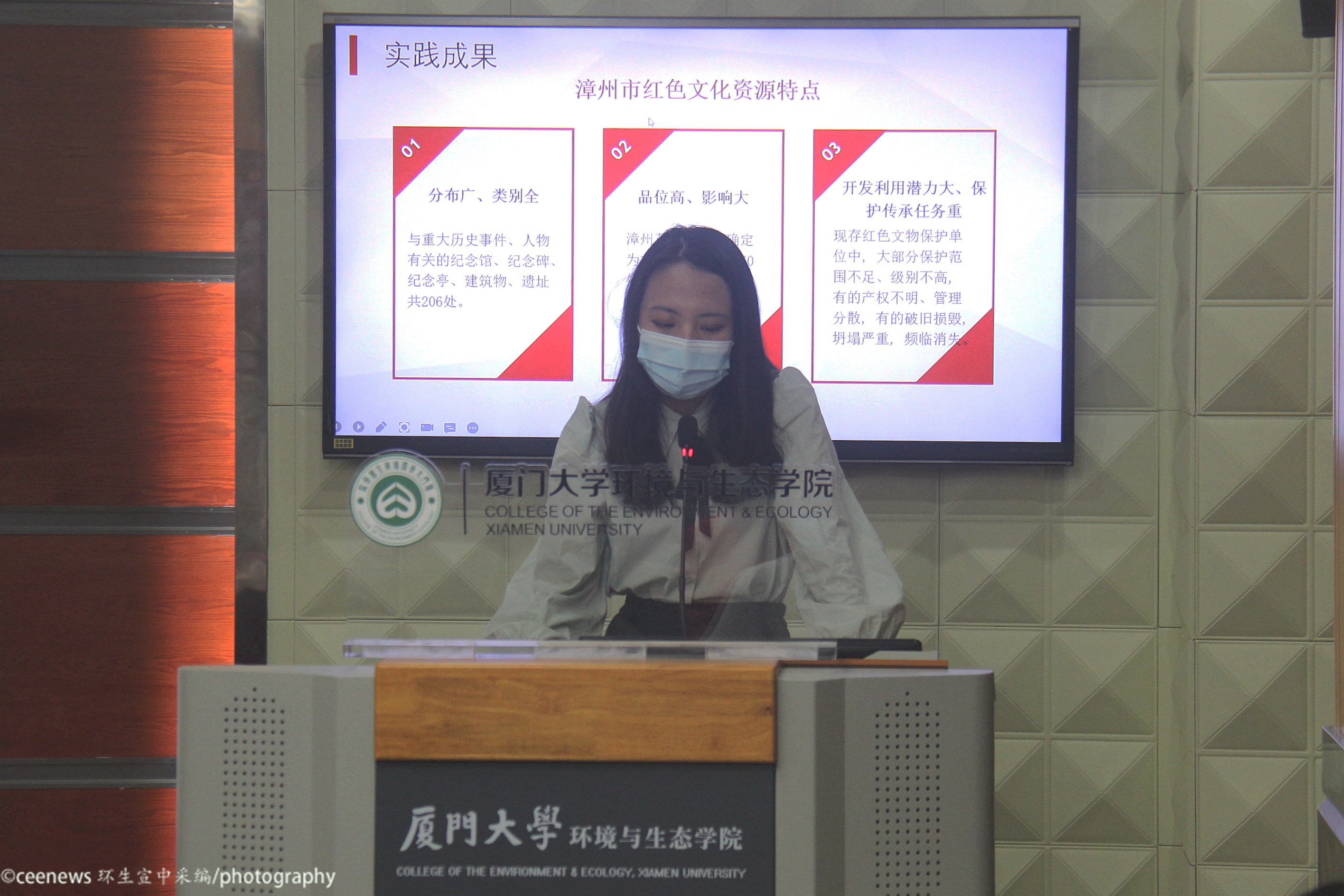 此次答辩分为团队答辩和院级社会实践积极分子候选人展示两个环节。首先进行团队答辩的是百年薪火实践队,他们以“乡村振兴下的生态环境建设”作为实践主题,对生态旅游和自然之美进行了实地调研。第二组海厦疫心实践队以口罩管控为主题,展示了在弓立医疗公司获得的调研成果,分析了企业在疫情防控中发挥的重要作用。第三组清清净河实践队围绕筼筜湖治理这一主题,展开了实地考察、线下采访等调研活动。紧接着城上启厦实践队以碳中和为研究主题进行了汇报,展示了实地考察江西赣州、广西柳州、北京以及福建厦门四个地区相关集团的实践成果。其后,碧水蓝天实践队聚焦“3R”原则这一主题,汇报关于改变传统生产方式、遵循循环经济的构想。厦沐云霄实践队以“福建省漳州市云霄县河长制实行情况调查”为主题,采用线下线上相结合的方式,召开线上座谈会并辅以实地考察得出研究结论。最后进行答辩的是星火征程实践队,小组成员围绕红色文化融合生态旅游的“红+绿”实践主题,前往谷文昌纪念馆、科岭景区、清泉岩进行实地调研,介绍了该发展模式的现状并提出建议。