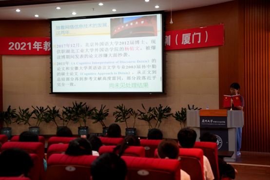 下午,林亚南老师在图书馆1号报告厅进行了校史校情的介绍,讲述了陈景润先生的传奇人生和精神魅力,由此引出了作为厦大四种精神之一的科学精神。学院党委书记张明智作为主持人进行了开场和总结发言。