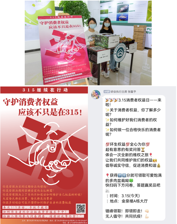 为提升学生的消费者维权意识,引导大家树立正确的消费观念,搭建校园消费维权交流平台,3月15日,我院举办了“3.15国际消费者权益日主题活动”。活动严格遵守学校防控办要求,原定于在竞丰餐厅门口举办的摆摊活动改为以线上扫码答题为主,线下宣传为辅的形式开展,不聚集。