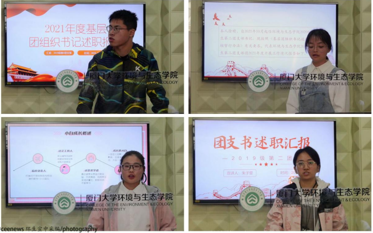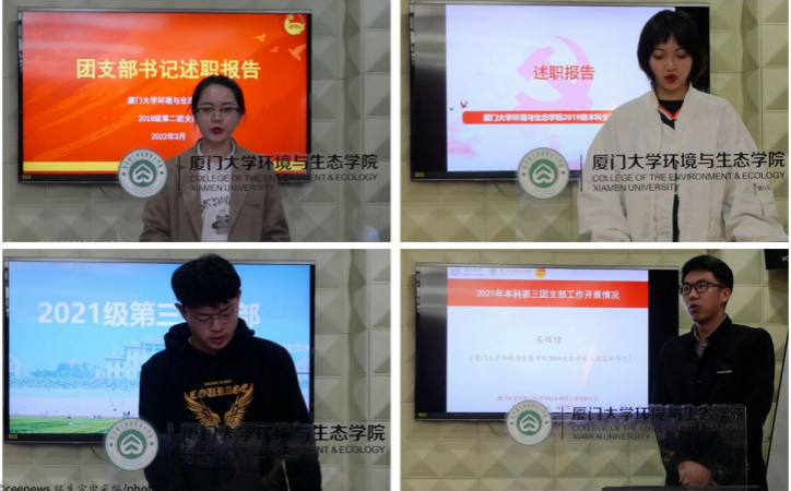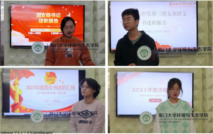 紧接着,22位团支书依次上台汇报。各团支书介绍了本团支部的组成人员和2021年度举办的党团活动,分享了自己在活动中的体会与感悟,总结了过去一年工作中的不足,并提出了2022年度的计划。