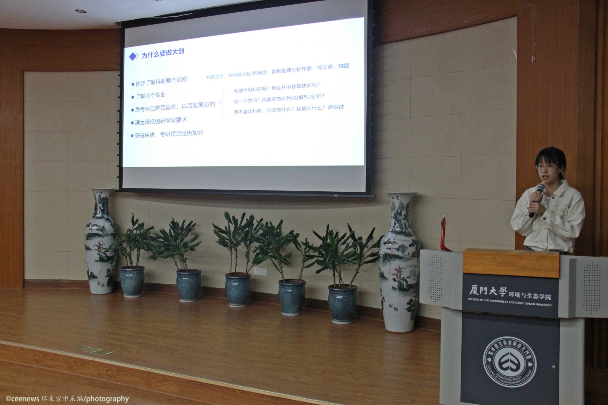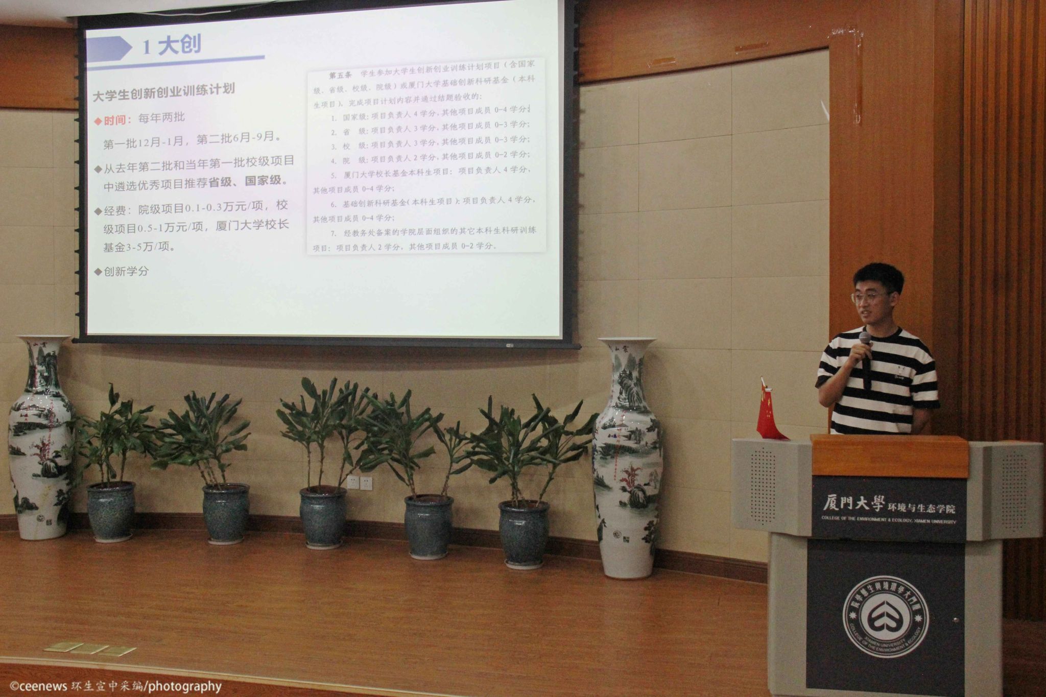 为了使同学们全面认识、参与大学生创新创业训练计划项目以及了解创新学分规定,4月23日晚,学院于金泉楼B103举办第42期科创专题学长学姐辅助计划。我院黄晓佳教授受邀参与本次活动,科创中心负责人马力楠、2018级生态学专业本科生许天云、2018级环境生态工程专业本科生汪雪婷、2019级环境生态工程专业本科生洪恺声到场分享经验,2020级、2021级本科生到会听讲,胡琪同学主持本次活动。