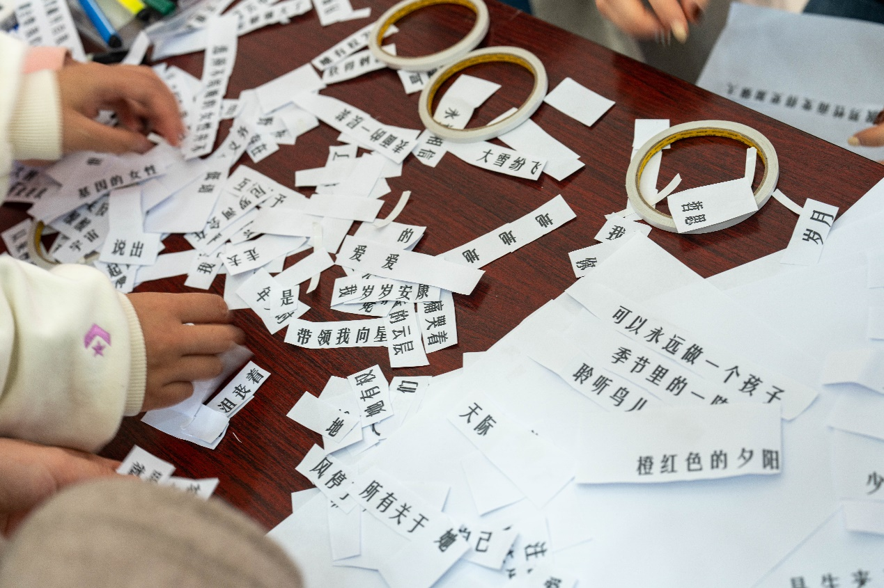 在“风传花信,雨濯春尘”拼贴诗活动中,女生们巧手翻动,用一张白纸、一把剪刀、一管胶水,让文字挣脱桎梏、重新融合,在词句间碰撞出灵感的火花。一个个普通的词语,在同学们的手中变句成诗,展现“她”无尽的风采和千万种模样。