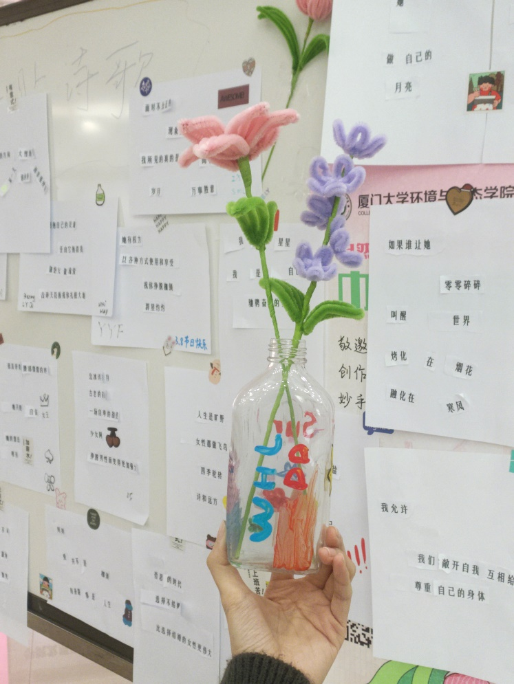 在“春色如许,拈花拾趣”活动中,学院团委通过春日之约和春花绘两个小活动,提供郁金香的扭扭棒材料包让女生们自己制作花朵,绘制玻璃瓶,感受手工的魅力,留存爱与纪念。