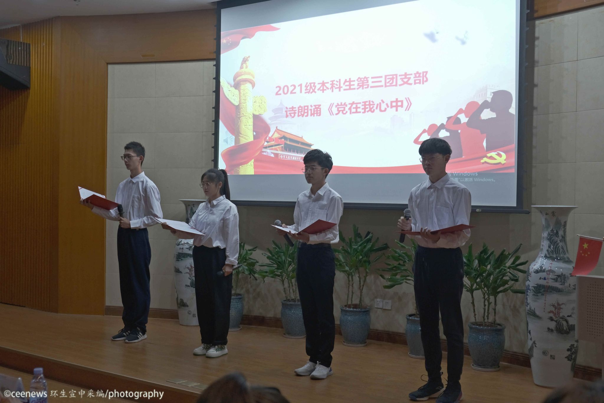 首先登场的是2021级本科生第三团支部,他们带来了声情并茂的诗歌朗诵《党在我心中》,朗诵者们以满腔豪情和热血追寻伟大祖国的足迹,歌颂党史光辉历程,抒发心中对中国共产党和伟大祖国的无比崇敬和热爱,让在场所有人都永远铭记和感谢党的恩情。