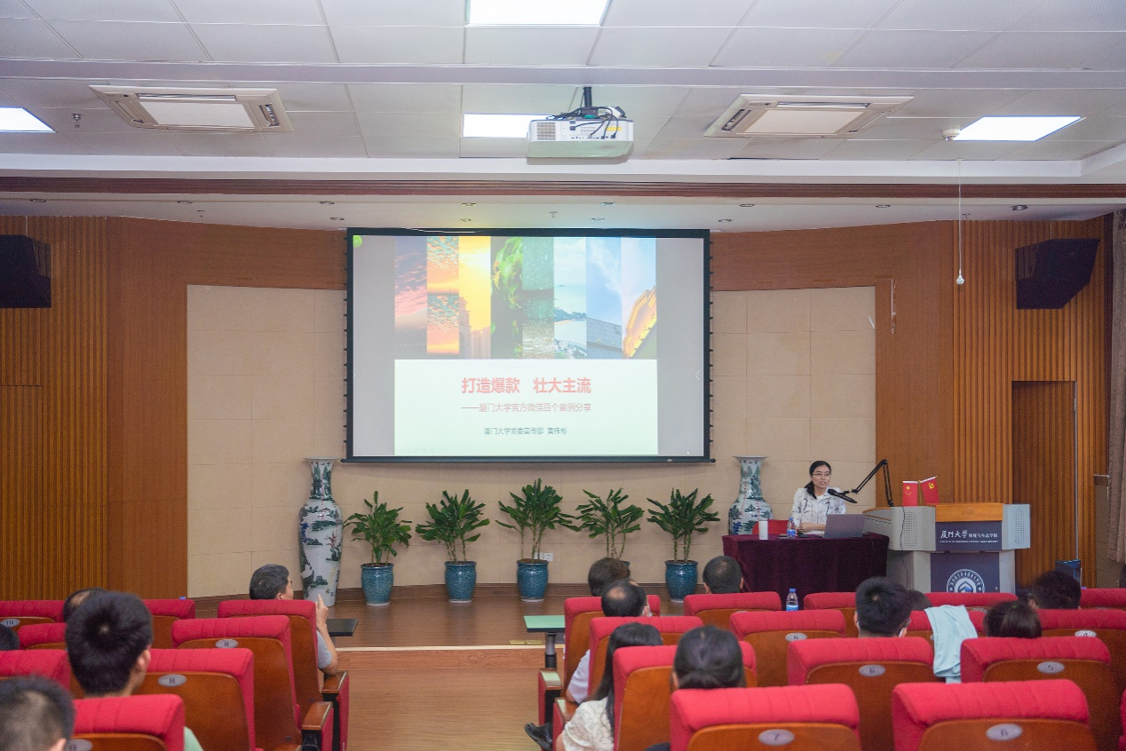 党委宣传部秘书黄伟彬作题为“打造爆款 壮大主流——厦门大学官方微信百个案例分享”的新媒体运营经验分享。她选取厦大官微日常工作中的100个典型案例,从寻找选题、入题角度、文案撰写、标题提炼、平台运营五个方面,讲述如何在微信平台打造爆款内容,壮大主流声音。