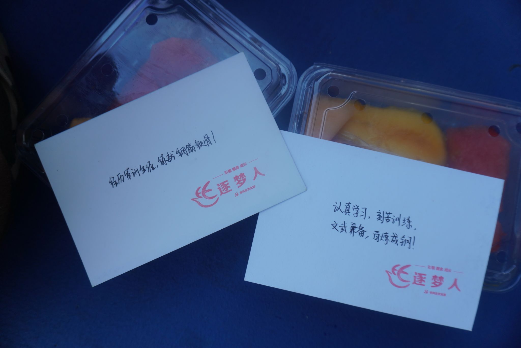 炎热的酷暑击垮不了大家如铁的意志,挥洒的汗水淹没不了大家心中的信念。在烈日骄阳下,同学们站军姿、走正步,体现出了环生学子蓬勃的青春朝气和昂扬的精神状态。慰问前,学生会干部贴心地在同学们的座位上放上了水果、小面包等慰问食品。在慰问中,学院本科生党支部还为每一位军训的同学精心准备了写有不同鼓励词句的明信片,相信同学们定能如明信片上所写一般:“认真学习,刻苦训练;文武兼备,百炼成钢!”