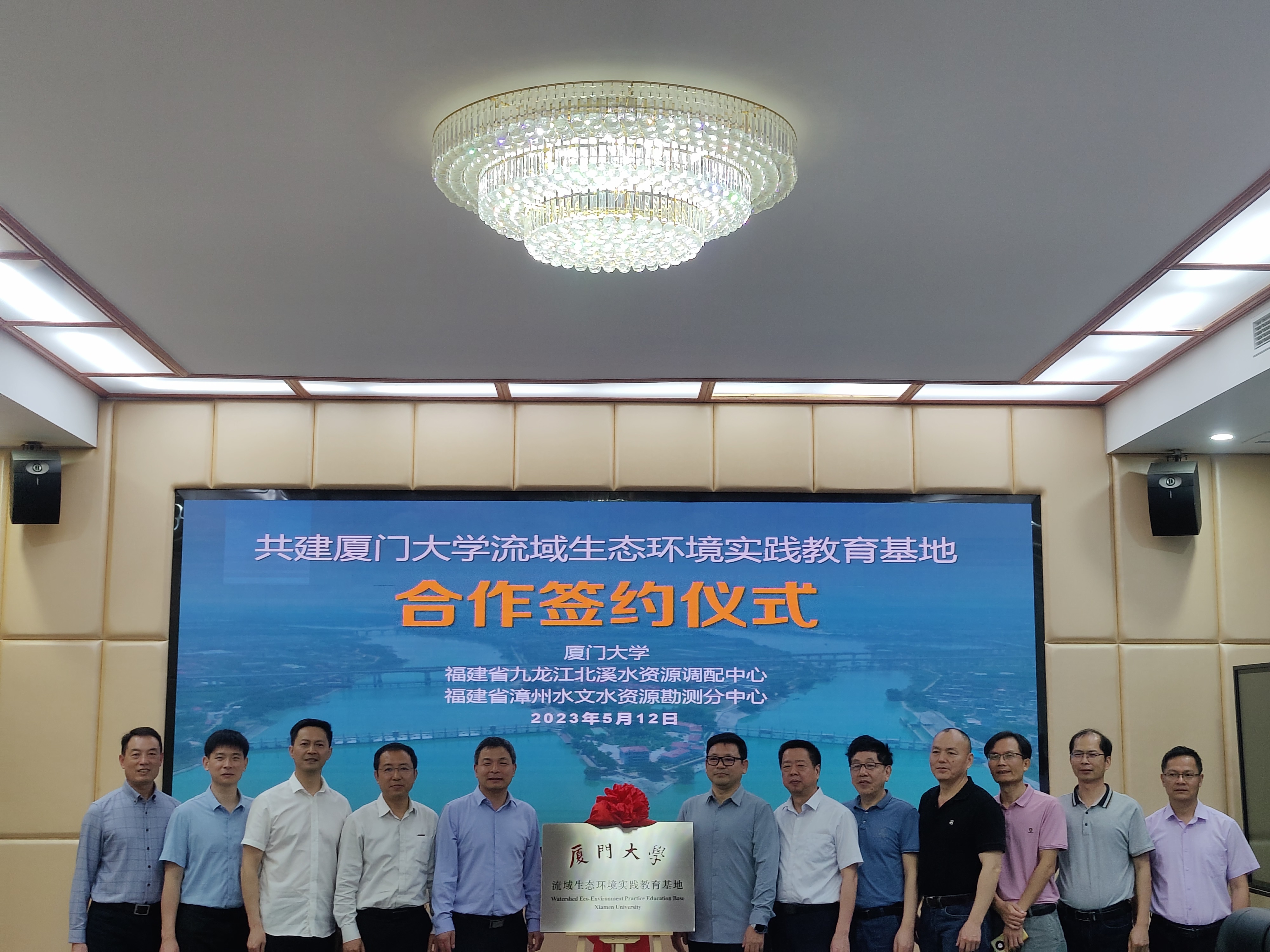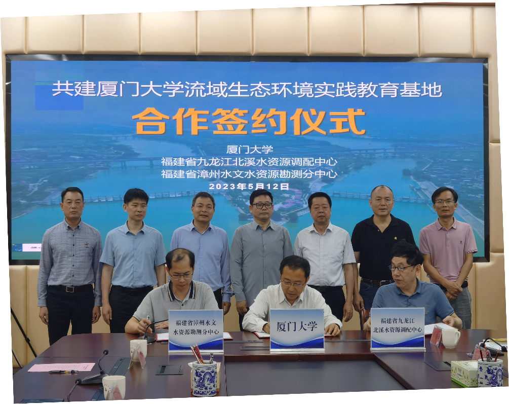 5月12日上午,厦门大学与福建省九龙江北溪水资源调配中心、福建省漳州水文水资源勘测分中心合作共建“厦门大学流域生态环境实践基地”的签约揭牌仪式在九龙江北溪水闸管理中心举行。福建省九龙江北溪水资源调配中心主任黄永光、福建省漳州水文水资源勘测分中心主任李勇辉、厦门大学教务处副处长何海涛以及我院副院长黄凌风、环境科学系系主任陈能汪、团委书记郑淑真等领导和嘉宾出席了本次签约揭牌仪式。仪式由陈能汪主持。