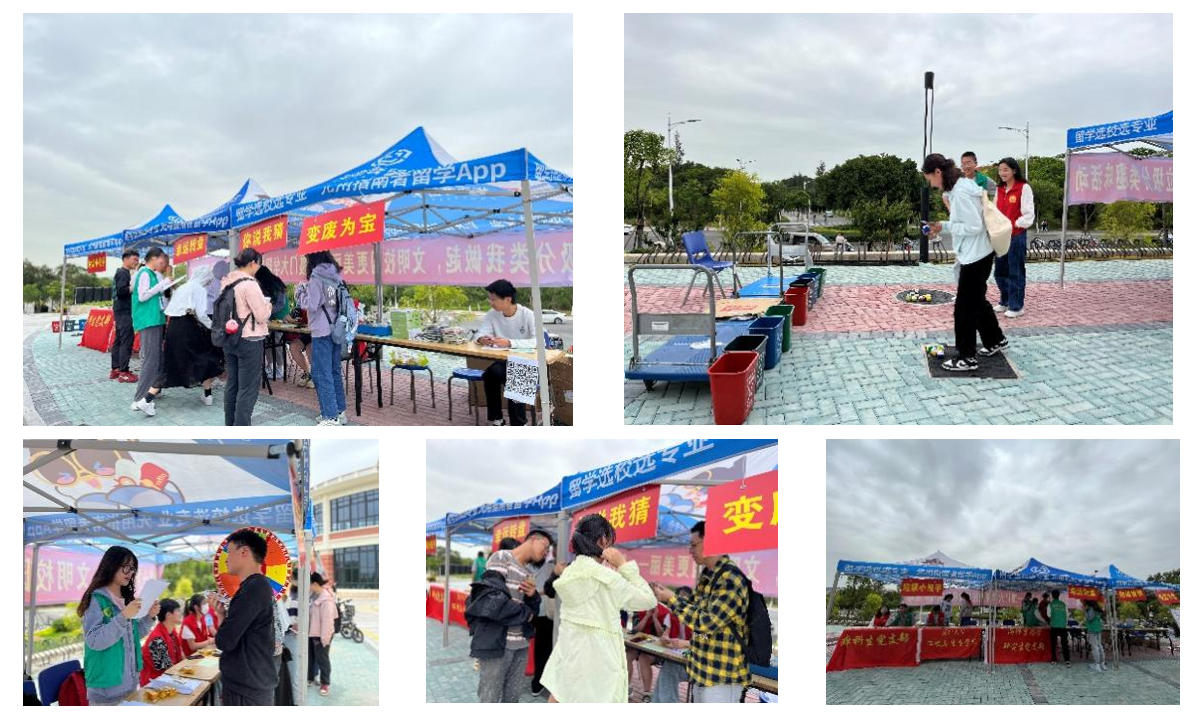 本次活动在整个校区进行广泛宣传并招募志愿者,由党员同志带头参加,分别在厦门大学翔安校区丰庭餐厅、竞丰餐厅以及思源餐厅门口进行摆摊宣传垃圾分类知识,活动范围广,让全校师生都能够有机会参与本次垃圾分类活动中。此次活动的亮点在于采取了游戏积分制,游戏参与者能够获得一张积分卡,通过设计的“垃圾小投手”、“你说我猜”以及“幸运转盘”三个小游戏来获得积分并兑换精美奖品。除此之外,还设计了“垃圾变艺术”环节,鼓励参与者自己动手改造身边的废弃物品。这种方式大大增加此次活动的趣味性与丰富度,活动参与者能够通过投球、答题、DIY等方式学习到日常生活中有关垃圾分类的小知识并更能深入理解垃圾分类的意义。