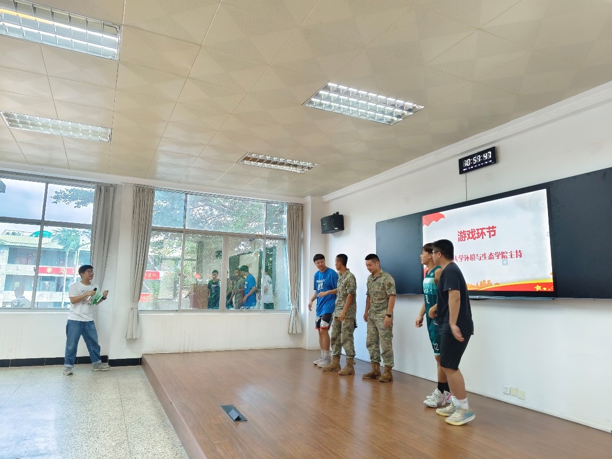 厦大师生将颗颗拥军的真心化为热烈又温情的节目,向这群最可爱的人致以最崇高的敬意。部队官兵也为大家献上了一段精彩的歌颂军民鱼水情的快板,战士们编写的快板词诙谐幽默,聚焦基层连队的人和事,引得大家笑声不断,连连叫好绝,军民互动暖人心怀。在文艺表演中场休息环节,我院环境化学研究生党支部的同学们带来“五毛一块”“筷子传递乒乓球”和“数字套圈比大小”三个小游戏,将气氛推向一个又一个高潮,师生和官兵们争相组队、同台竞技,游戏妙趣横生,现场充满欢声笑语。最终,整场文艺活动在一曲激昂的《爱我中华》中圆满落下帷幕。
