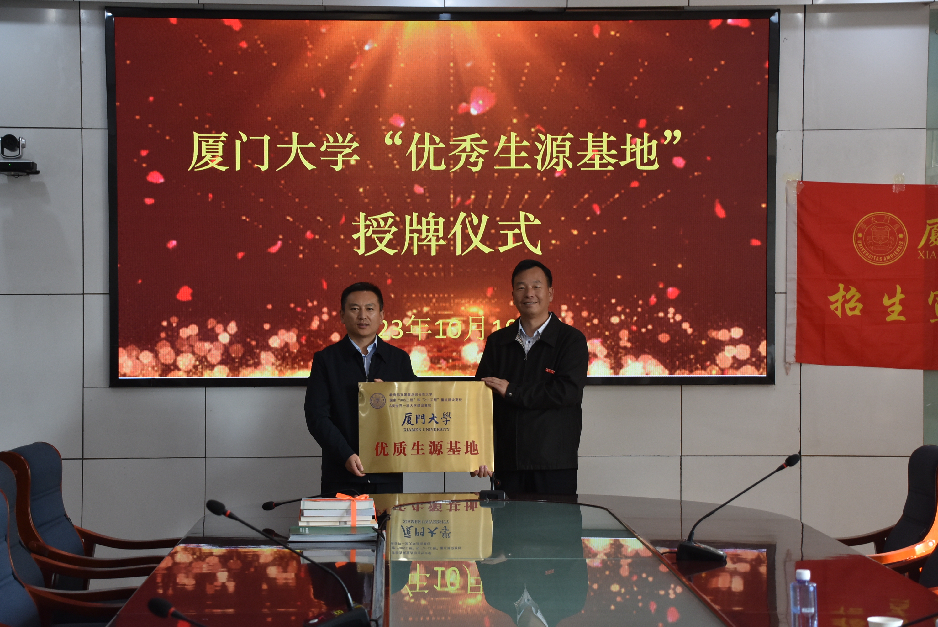10月10日,招生宣传组在兰州市五十八中举办“厦门大学优质生源基地”授牌仪式,蔡虎堂向中学赠送厦大百年校庆系列出版物的部分书籍及相关招生材料。随后,双方开展了座谈交流。蔡虎堂介绍了厦门大学的校史校情、学科建设、师资队伍以及人才培养特色等基本内容。近年来,兰州市五十八中持续为厦门大学输送优质生源,共同育人成效显著,双方均表示希望有更多的优秀学子选择厦门大学求学深造,一致认为要以授牌为契机建立常态化合作关系,为国家和社会培养更多高知识、高素质、高能力的人才。