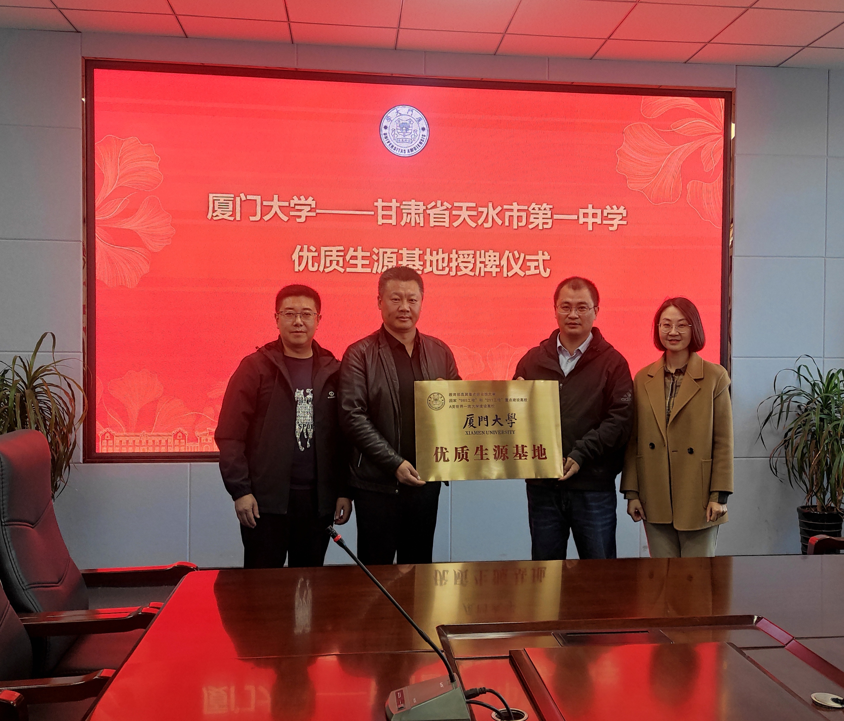 天水一中副校长付小鹏、教务处主任韩云亮等对我院招生组一行表示欢迎,并对天水一中学生基本情况作了详细介绍。马剑对天水一中近年来为厦门大学输送了多名优秀学生表示感谢,并介绍我校办学条件、区位特点、人才培养等情况。随后,双方举行了“优质生源地”授牌及赠书仪式。