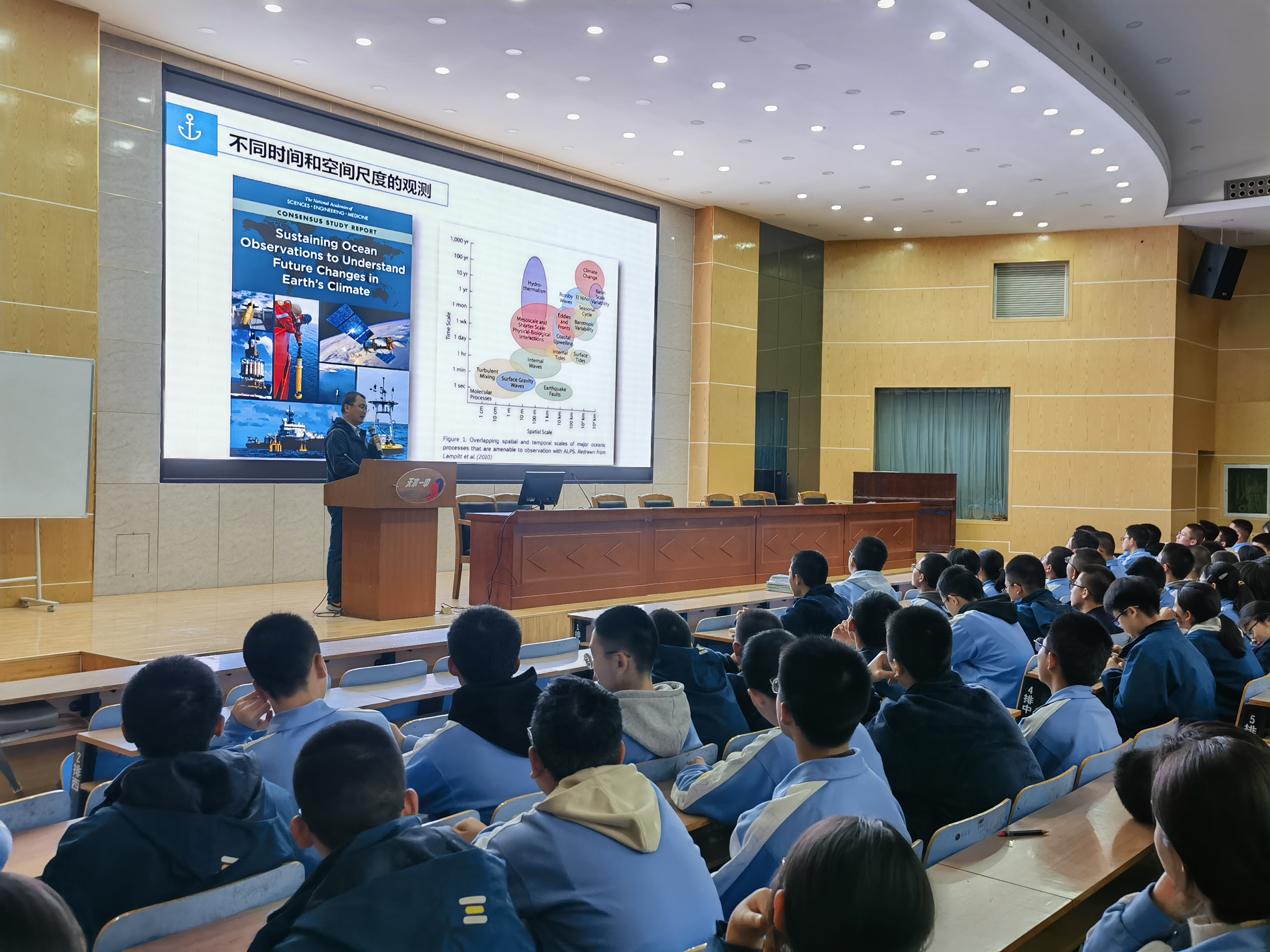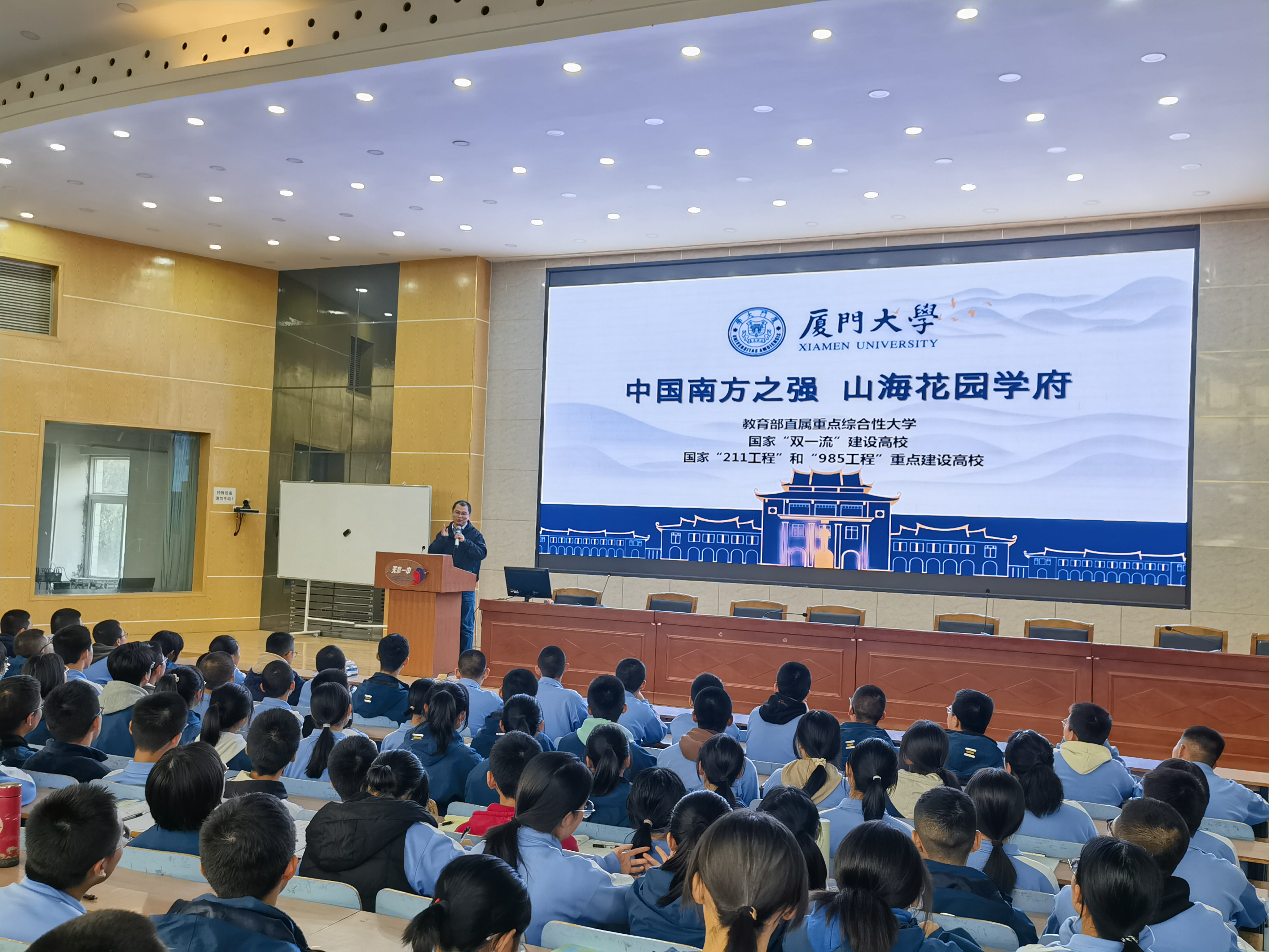 座谈会结束后,马剑为天水一中600余名学生作题为“我在厦大作观测”的科普讲座。他以生动风趣的语言,深入浅出地讲述了厦大环境、生态、海洋等相关学科的悠久历史,以及多年来面向国家战略需求开展的系列前沿研究工作与取得的成果。他鼓励同学们志存高远,学成报国,并欢迎大家积极报考厦门大学。