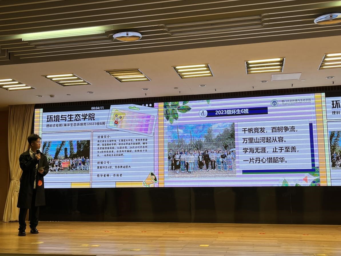 决赛现场,班长李郑瀚围绕班级概况、学风建设和班级建设三个方面展开,展现了六班学子在学习生活、社会实践和文体活动中青春洋溢、昂扬向上的精神面貌。在学习方面,班级召开主题班会,在班会上庄严宣誓,要努力成为优良学风的提倡者、践行者、传播者;在文体活动方面,班级同学积极参加学生田径运动会、心理剧、新生篮球赛、排球赛等比赛,取得了较好的成绩;在实践活动方面,积极参加学院组织的园林植物园、厦门市政综合管理公司和下潭尾红树林公园等实践学习,不断构建专业认知和提升专业素养。