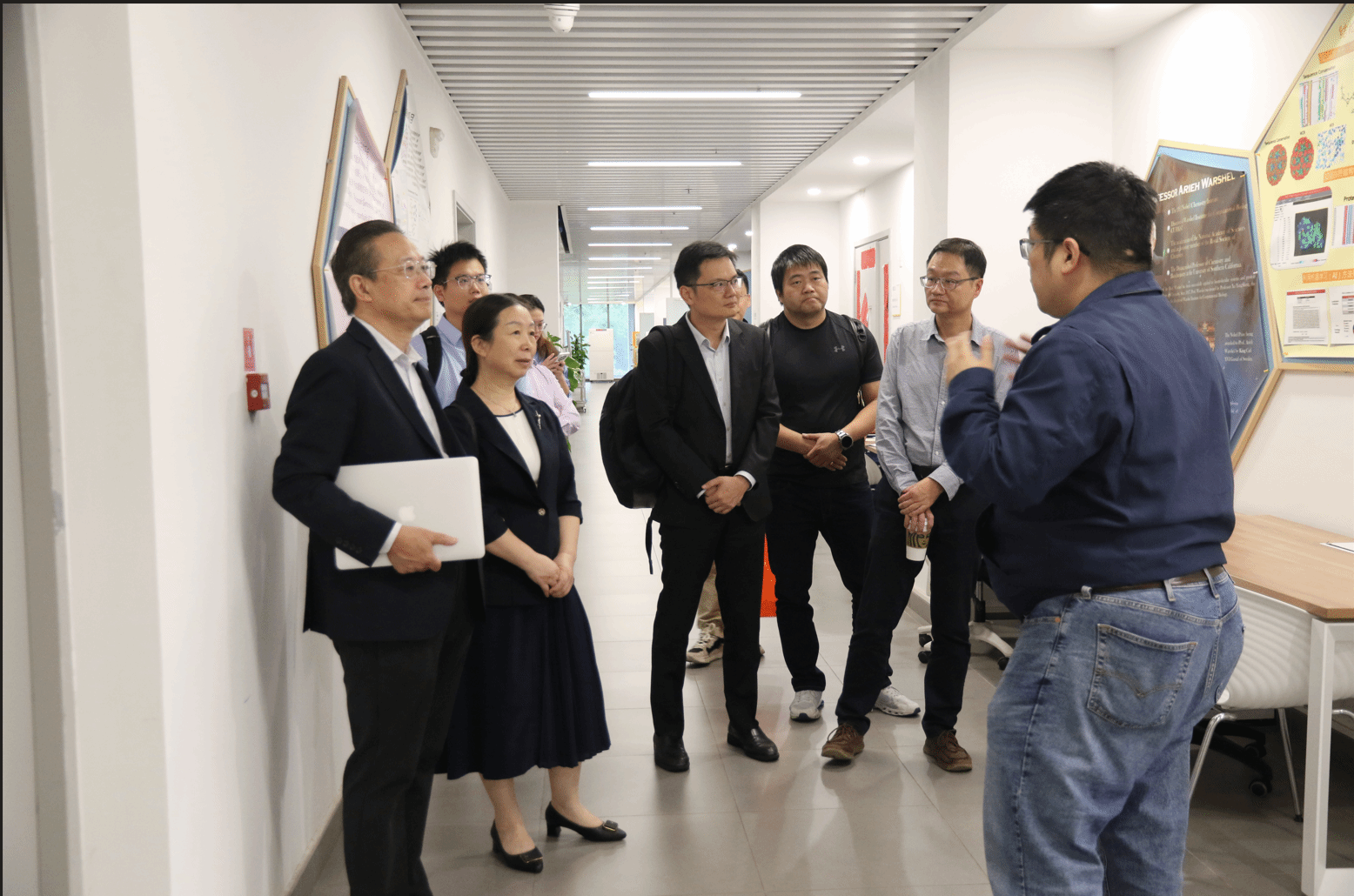 座谈交流后,交流团在港中深医学院老师的陪同下参观了诺贝尔奖科学家实验室--瓦谢尔计算生物研究院。该研究院由2013年诺贝尔化学奖得主阿里耶·瓦谢尔教授领衔创建,是香港中文大学(深圳)首批创建的诺贝尔奖科学家实验室之一。交流团对研究院的科研方向、运行模式及国际化科研环境进行深入了解并给予高度评价。