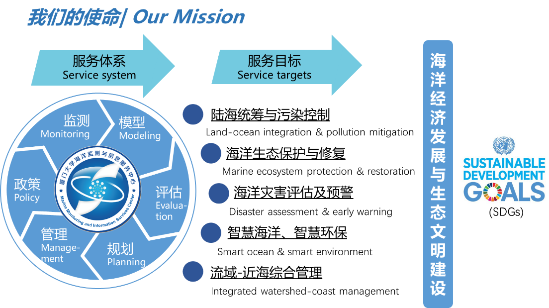 厦门大学海洋监测与信息服务中心(MMIS)是厦门大学和厦门南方海洋研究中心共建的海洋科技服务创新平台。中心依托厦门大学环境与生态学院、近海海洋环境科学国家重点实验室等单位的科研优势,整合海洋、环境、生态等一流学科资源,着力建设海洋大数据中心与海洋云,致力于科技成果转化与应用,为海洋与海岸带生态环境保护、防灾减灾、陆海统筹管理和生态文明建设提供一流科技服务。环境与生态学院洪华生教授担任MMIS的首席科学家,近海海洋环境科学国家重点室(厦门大学)主任、中国科学院院士戴民汉教授领衔成立专家顾问委员会,环境与生态学院陈能汪教授组建多学科研发团队,开展通过一系列应用技术创新,建立监测-模型-评估-规划-管理-政策整体解决方案的服务体系。