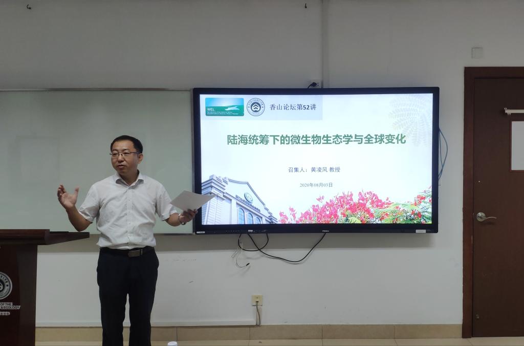 2020年8月3日,“厦门大学环境与生态香山论坛”(以下简称香山论坛)第52讲:“陆海统筹下的微生物生态学与全球变化”在厦门大学翔安校区金泉楼顺利召开。本次论坛由我院黄凌风教授发起,兰州大学李祥凯教授、中国科学院海洋研究所肖天研究员、西安文理学院高天鹏教授、重庆大学李宏副教授以及我院于鑫教授、卢豪良副教授应邀分别作了精彩的报告分享。重庆大学赵亮副教授,厦门大学生命科学学院田蕴教授、我院欧阳通教授、景有海副教授以及研究生等30余人参与了交流讨论。