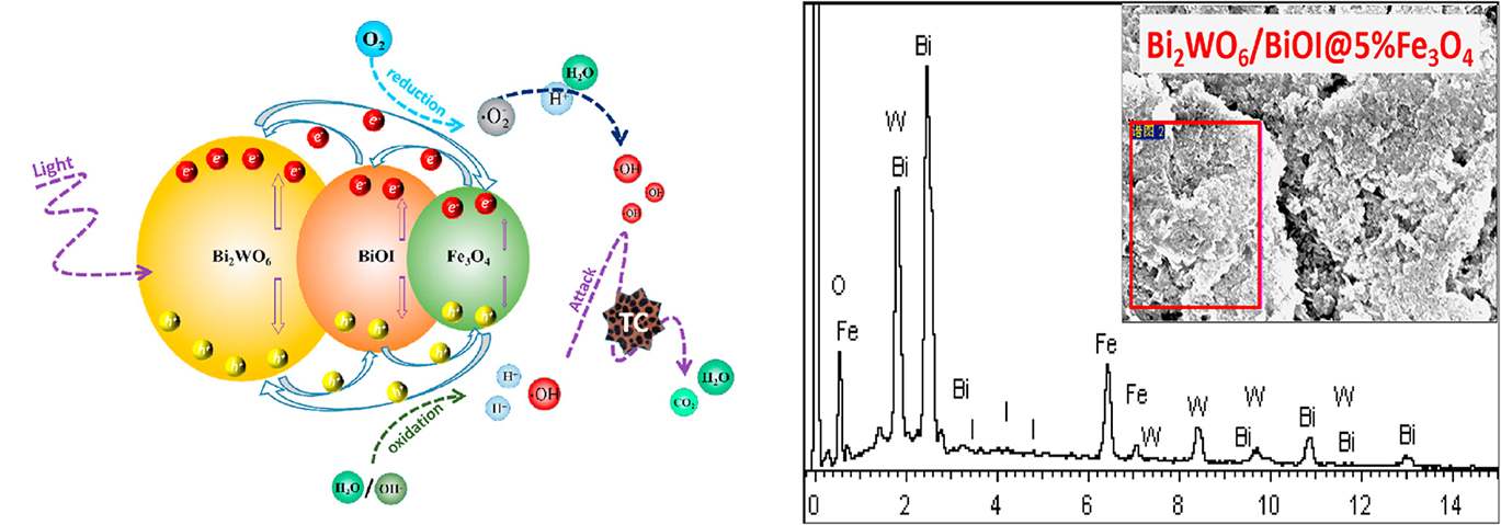图2 Bi2WO6/BiOI@5%Fe3O4纳米复合材料光催化降解四环素机理示意图及EDS能谱图