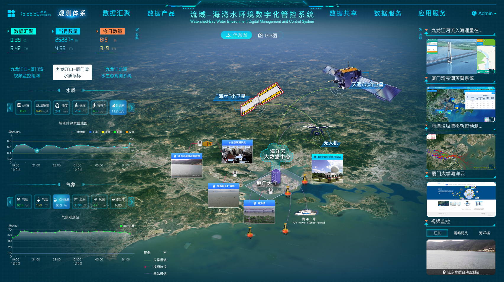 “流域-海湾水环境数字化管控系统”针对海陆界面主要生态环境问题,融合了监测新技术、模型耦合技术和人工智能技术等,通过在河流入海断面布设声层析高频温流测量系统、营养盐在线监测系统、水质生态多参数在线监测系统,以及在河口断面布放水质生态综合浮标、视频监控系统,并基于物联网、区块链、大数据和人工智能等技术,形成监测、模型与信息海洋云服务平台。