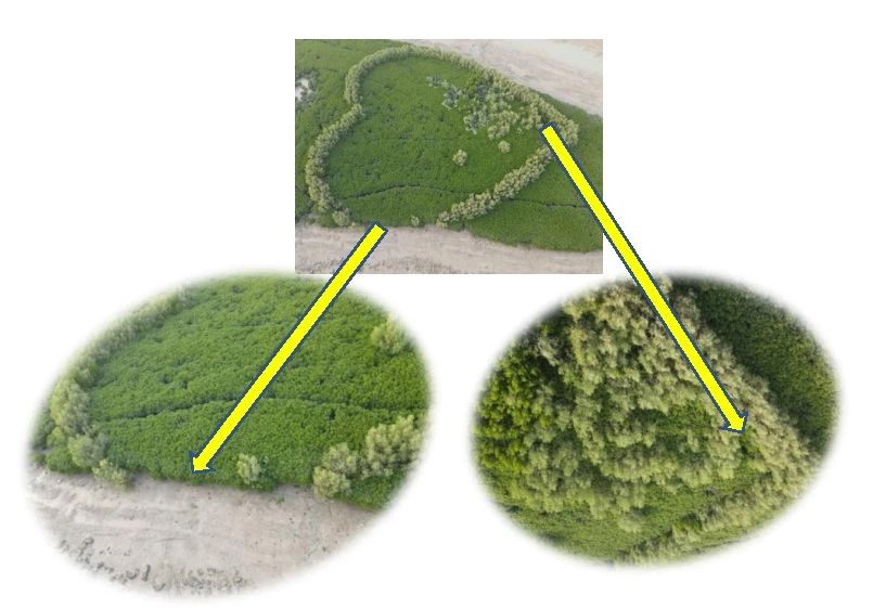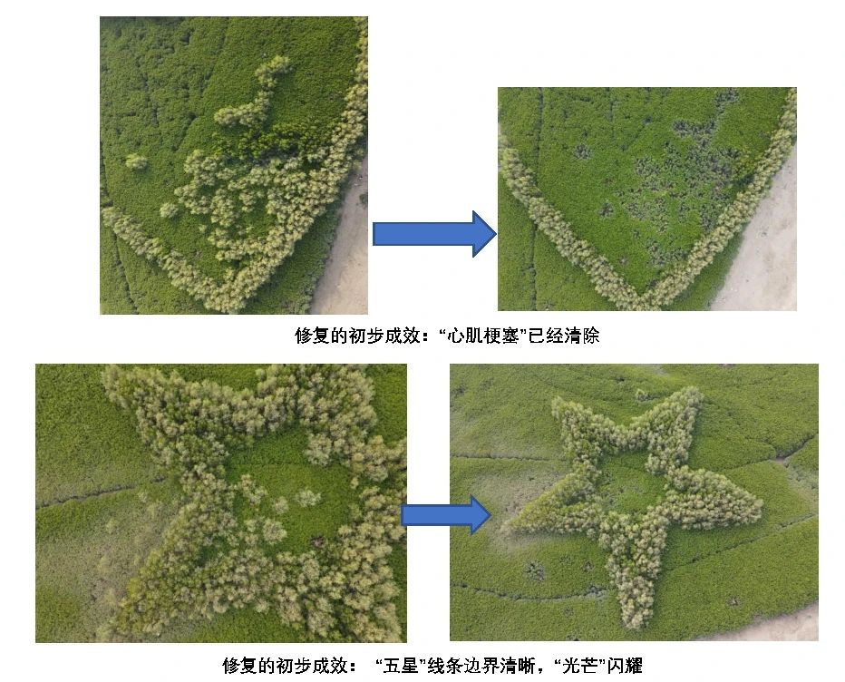 于是,大家想到,由无人机航拍配合,通过对讲机指挥其他成员工作。后来由于觉得对讲机的沟通效率还是太低,卢昌义便请无人机操作员一起上岛涉泥潭,由无人机传递的信息,当即指挥,请走“错位”的树木或补植勾勒爱心线条的植株。