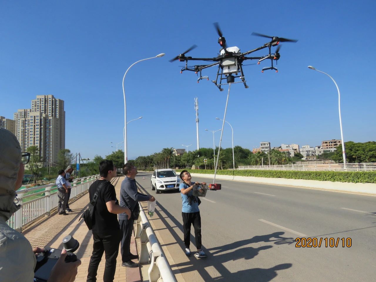 卢昌义团队研发了使用大型无人机进行红树林采样工作的技术,图为团队成员在收取框中的样品