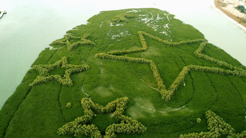 此时的卢昌义灵感一闪,与同事们一道,决定利用不同种类红树植物生长速度及群落外貌颜色的差异,在滩涂上勾勒一幅“我爱祖国”的地标景观。