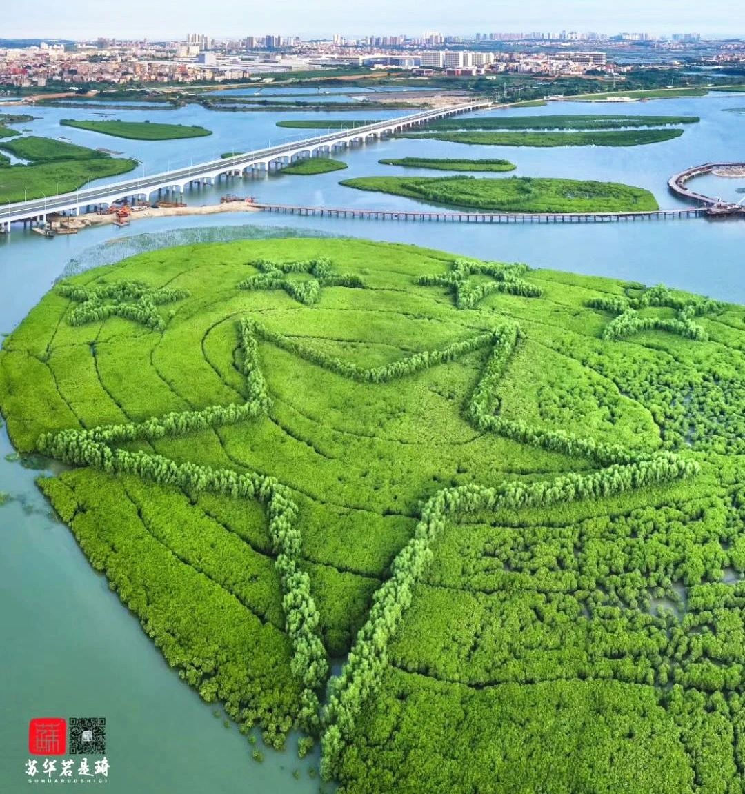 这幅画作名为《我爱祖国》,由分布在三个小岛上的用红树林勾勒的大写英文字母“I”、图案“❤”和组图五星及背景红树林构成,单“五星”图案占地就相当于18个足球场大小,是厦门市下潭尾滨海湿地公园一期工程的核心部分。
