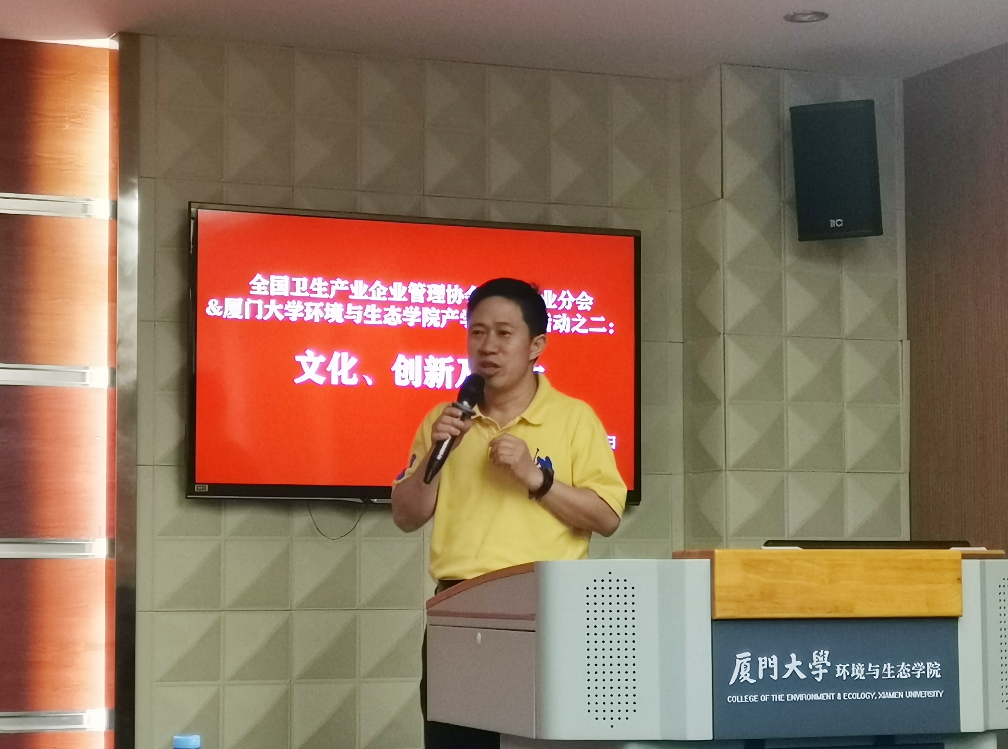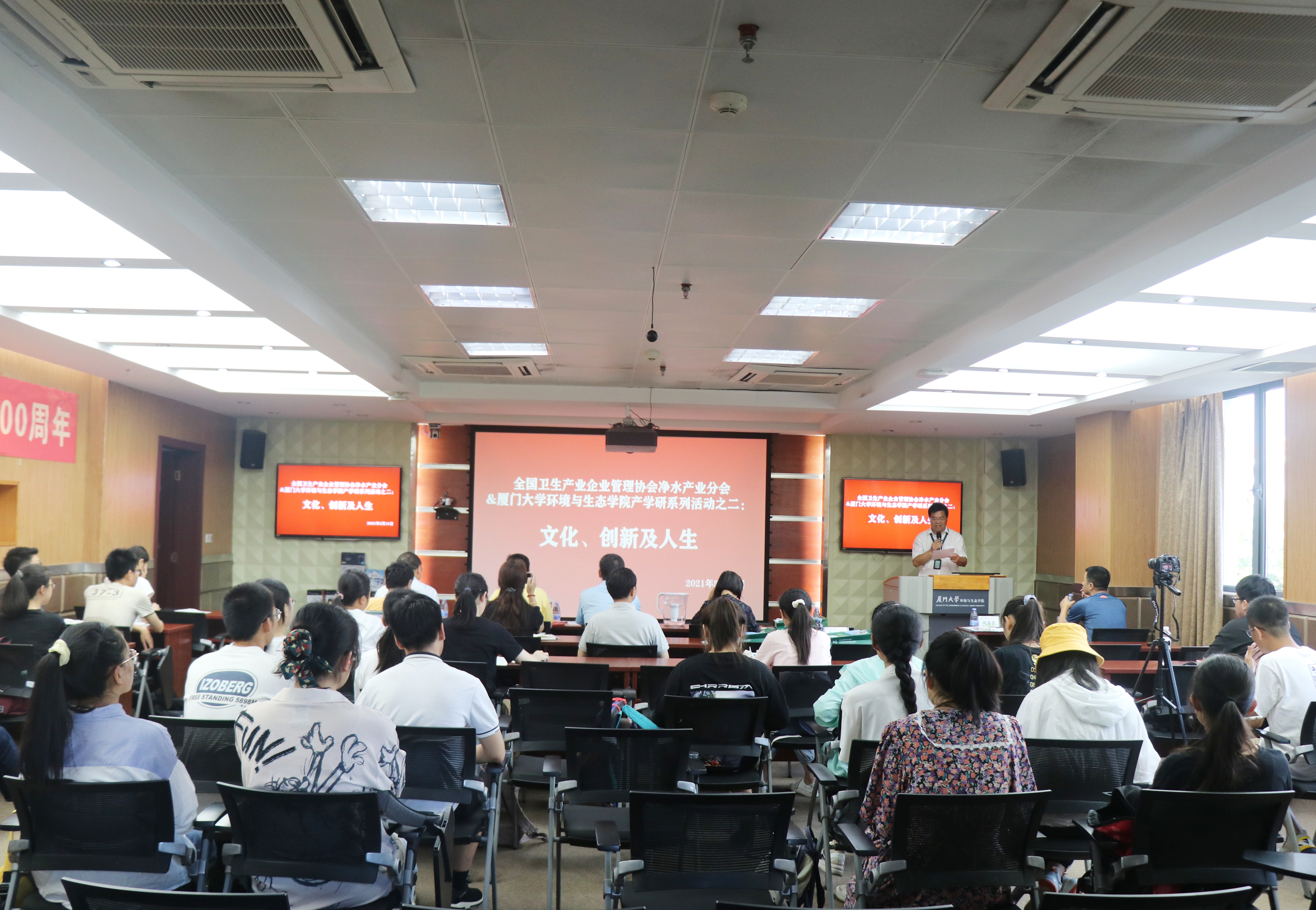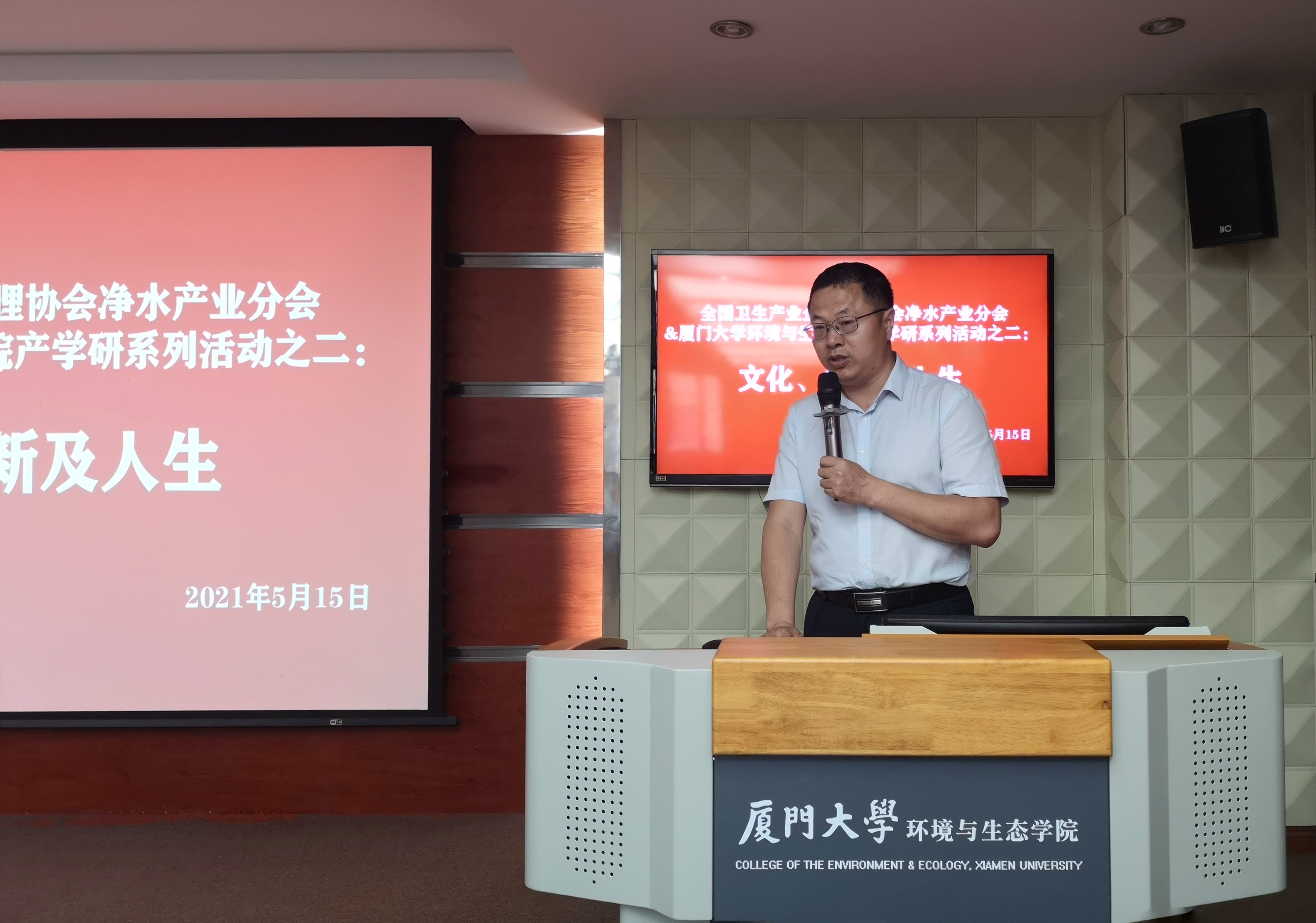 5月15日上午,学院与全国卫生产业企业管理协会净水产业分会(以下简称“净水产业分会”)联合开展的产学研系列活动——《文化、创新与人生》主题讲座,在金泉楼A239会议室举行。副院长王文卿、卓越班班主任杨盛昌、环境生态工程系副主任欧阳通及教师代表周克夫、闫俊美、刘珺等,同卓越班2018级、2019级本科生50余人参加了本次活动。净水产业分会副会长兼秘书长黄立,副会长、上海聚蓝水处理科技有限公司董事长吴菊素,常务理事、浙江聚倍科技集团股份有限公司董事长刘小林,政企事务部副部长、厦门百霖净水科技有限公司特助张丛升,美国邦登净水销售总经理赵亮和厦门百霖净水有限公司开发部高级经理梁德胜也参加了本次讲座。