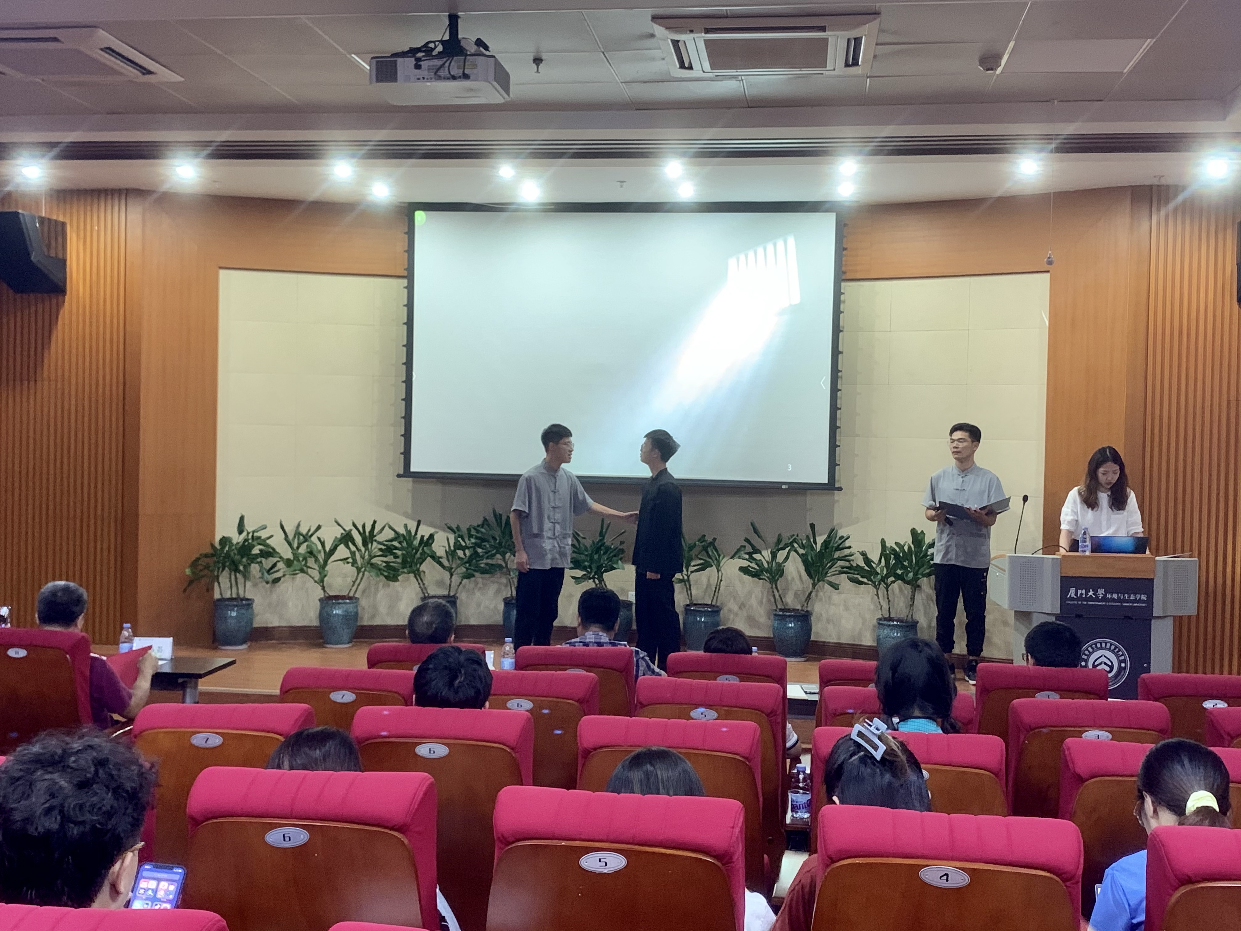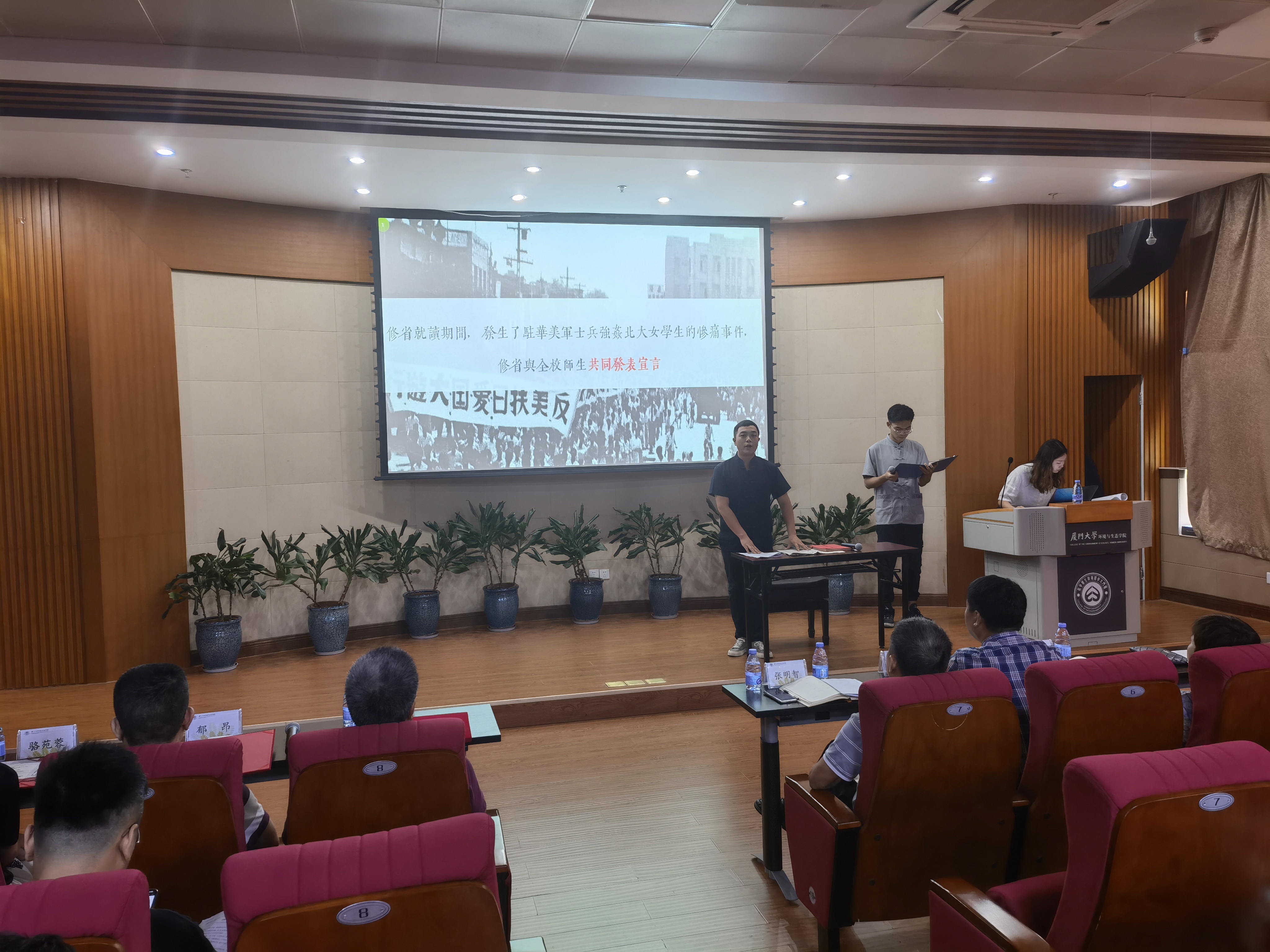 海洋生态学研究生党支部的2019级博士研究生姜成朴、2020级硕士研究生黄一分别演绎了白雪娇和肖炳实两位厦大人的爱国故事。爱国华侨白雪娇是厦门大学1936级中文系学生,当国家急需在南洋招募熟练的司机及机工回国服务时,她毅然应征,奔赴烽火连天的抗日战场,希望成为滇缅公路机工队的一员,临走前她给父母留下了一封告别信,信中写道:“现在什么也不能阻挠我投笔从戎了”、“我希望我能在救亡的汪流中, 竭我‘一滴’之微力”、“在祖国危难时候, 正是青年人奋发效力的时机”。而身为厦门大学历史系教授的共产党情报人员肖炳实,在抗日时期多次侦获重要情报信息,并为世界反法西斯战争中国际情报人员的培养工作做出了十分重要的贡献。但是他对自己的职位,从未有过需求,面对儿子对此的疑问,他给出了发自肺腑的回答:“干革命是为了追求信仰,不是为了地位名誉。”生态学系教工党支部的骆苑蓉老师、环境科学系教工党支部的马剑老师分别对书信进行解读。他们表示,这些厦大先辈们饱含家国情怀的书信,记述了他们对党和国家的热爱,对亲人的无限眷恋,对革命掷地有声的誓言。