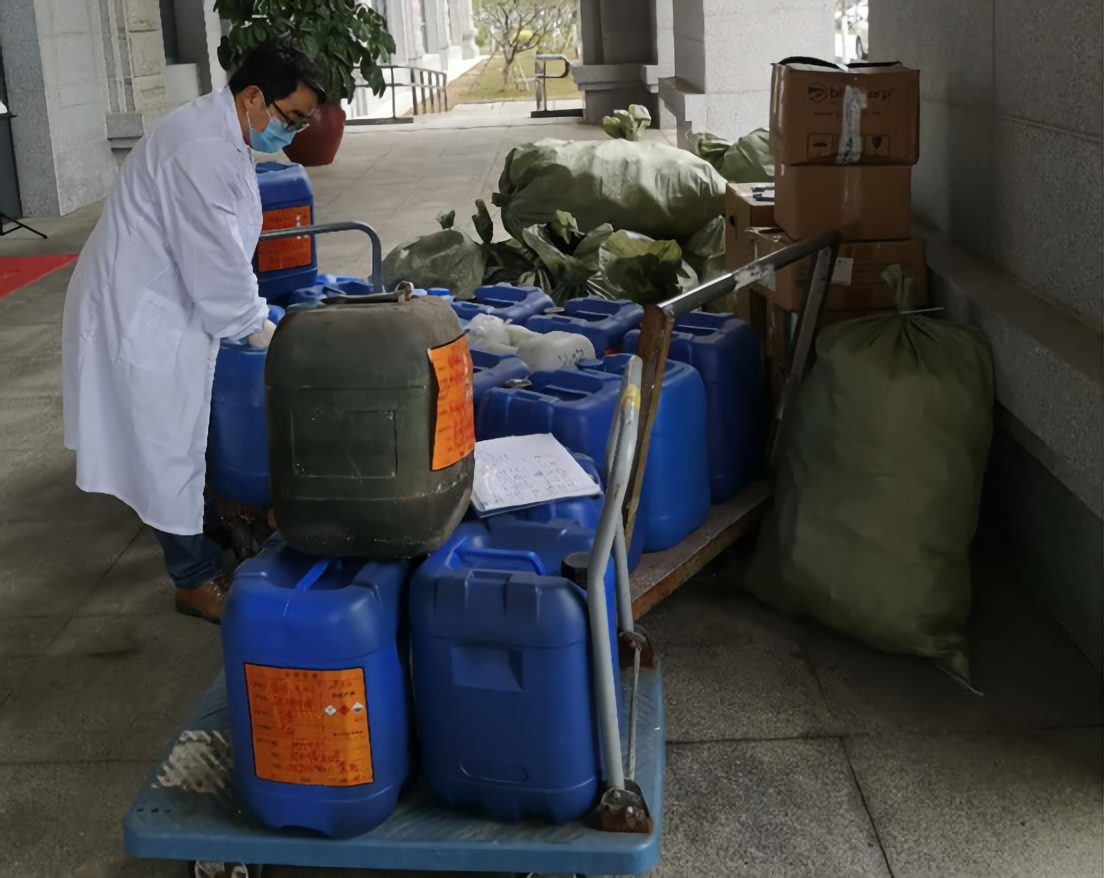 做好安全检查工作的同时,学院积极为师生做好实验室危险废弃物回收服务,及时处置转运实验室化学废液、过期试剂、空瓶、碎玻璃等,有效杜绝了实验室化学废液可能引起的爆燃、腐蚀、中毒等安全隐患,为师生营造了安全、舒适的实验环境。