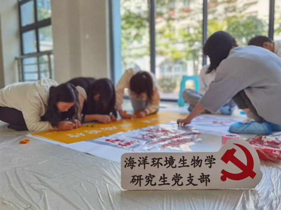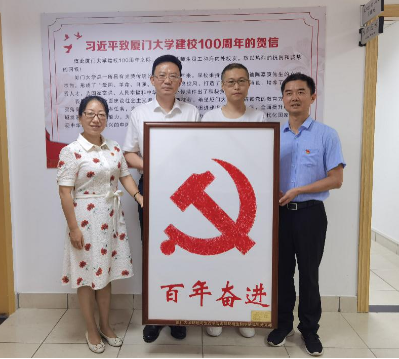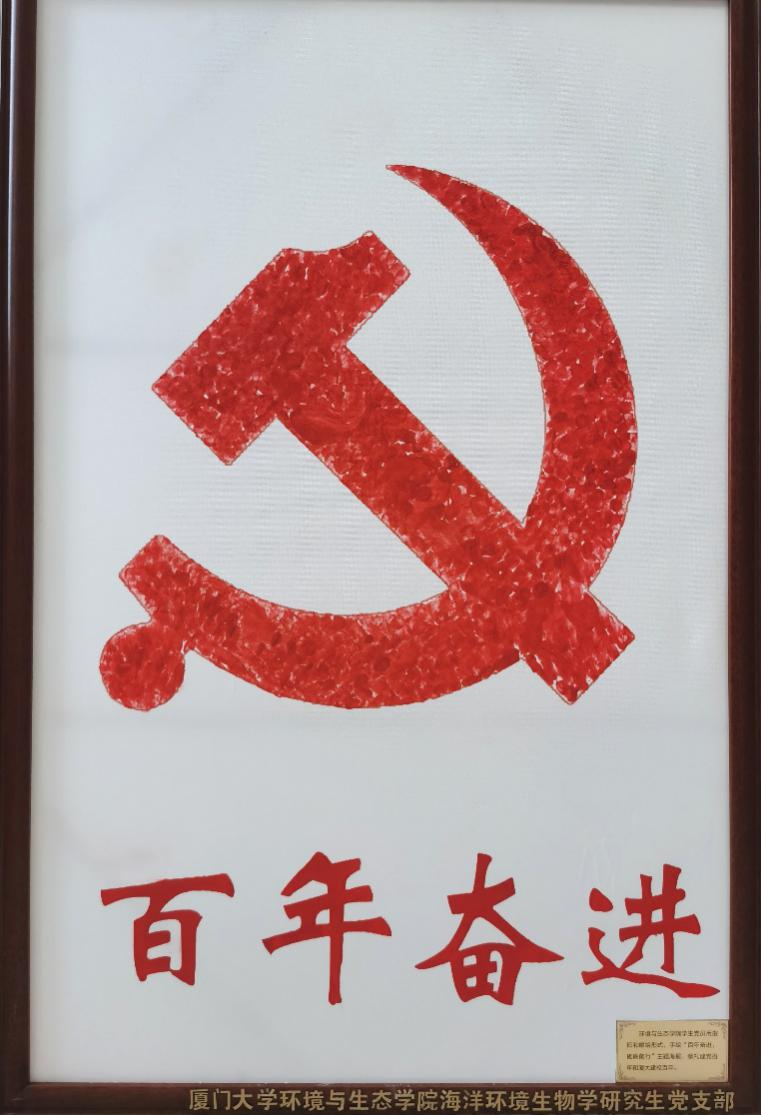 这幅党徽印画由环境与生态学院海洋环境生物学研究生党支部的学生党员和积极分子共同创作。支部书记张宇说:“建党百年是一个十分重大的历史节点,标志着我们党百年的峥嵘和辉煌,也代表着崭新征程即将开启。在这样一个意义特殊的时刻,大家的内心都很激动,很想亲手把这种情感做成礼物,献给我们亲爱的党和国家。”最终,该支部成员用手指作画笔,以红色代热爱,用一个一个手印绘制出对党和国家最真挚朴实的祝福。同时,支部党员还纷纷表示,身为党员,将勇担青年使命,继续奋斗前行。