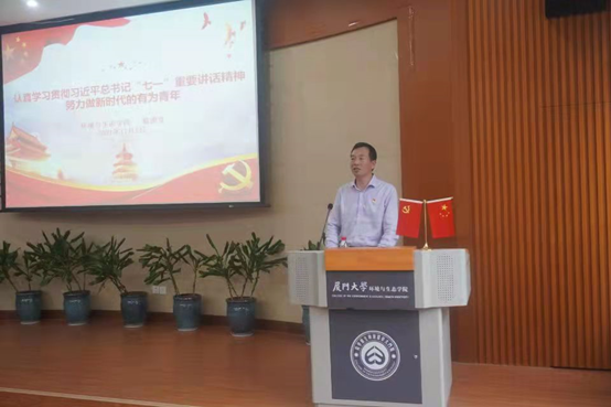 本年次党团活动月第一项活动是由院党委副书记蔡虎堂为同学们做的题为《认真学习贯彻习近平总书记“七一”重要讲话精神,努力做新时代的有为青年》的专题讲座。讲座中蔡虎堂全面解读了习近平总书记“七一”重要讲话内容,强调了习近平总书记的重要讲话是激励全党全国各族人民向第二个百年奋斗目标进军的政治宣言和行动纲领,对党和国家各方面、各领域工作具有深远的指导意义,是新时代进行伟大斗争、建设伟大工程、增进伟大事业、实现伟大梦想的强大思想武器和行动指南。他鼓励同学们要认真学习贯彻习近平总书记“七一”重要讲话精神,深入学习领会习近平总书记提出的一系列新思想、新观点、新要求,以实现中华民族伟大复兴为己任,增强做中国人的志气、骨气、底气,不负时代,不负韶华,不负期望,努力成为中华民族伟大复兴征程上的先锋力量,让“请党放心,强国有我”成为切实行动,努力做新时代的有为青年。
