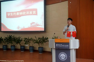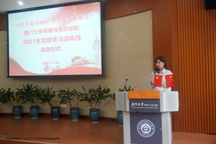 新生代表钟欣洋上台发言。他说在两个百年的交汇之际,2021级本科生作为环境与生态学院十周年后迎来的第一批学生,应延续“爱国、革命、自强、科学”的厦大“四种”精神,坚持“五位一体”总体布局,增强“绿水青山就是金山银山”的环境科学意识,响应时代赋予我们的使命召唤。