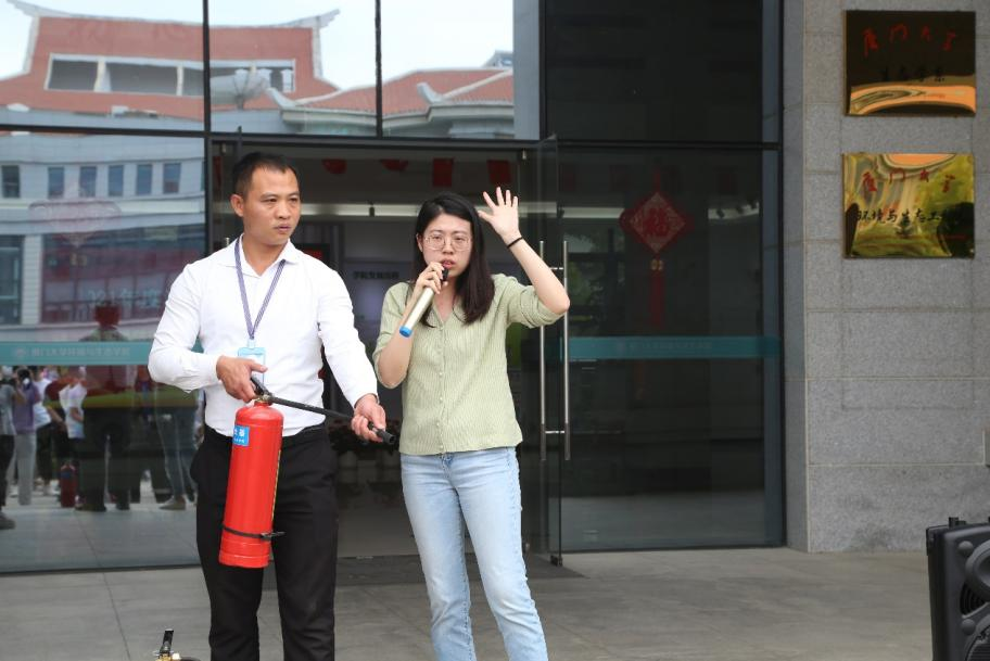 消防疏散演练后,大家在学院前空地处进行灭火技能的培训。学院工会主席杨盛昌、学院副院长王新红强调了消防安全以及掌握相关消防技能的重要性,副院长王新红对消防疏散演练做点评。学校保卫处叶菡讲解灭火器知识和实际操作的注意事项,她强调使用灭火器前应观察灭火器瓶内压强的状态,使用时应注意喷嘴的朝向,并且要根据风向选择灭火器的使用方向。