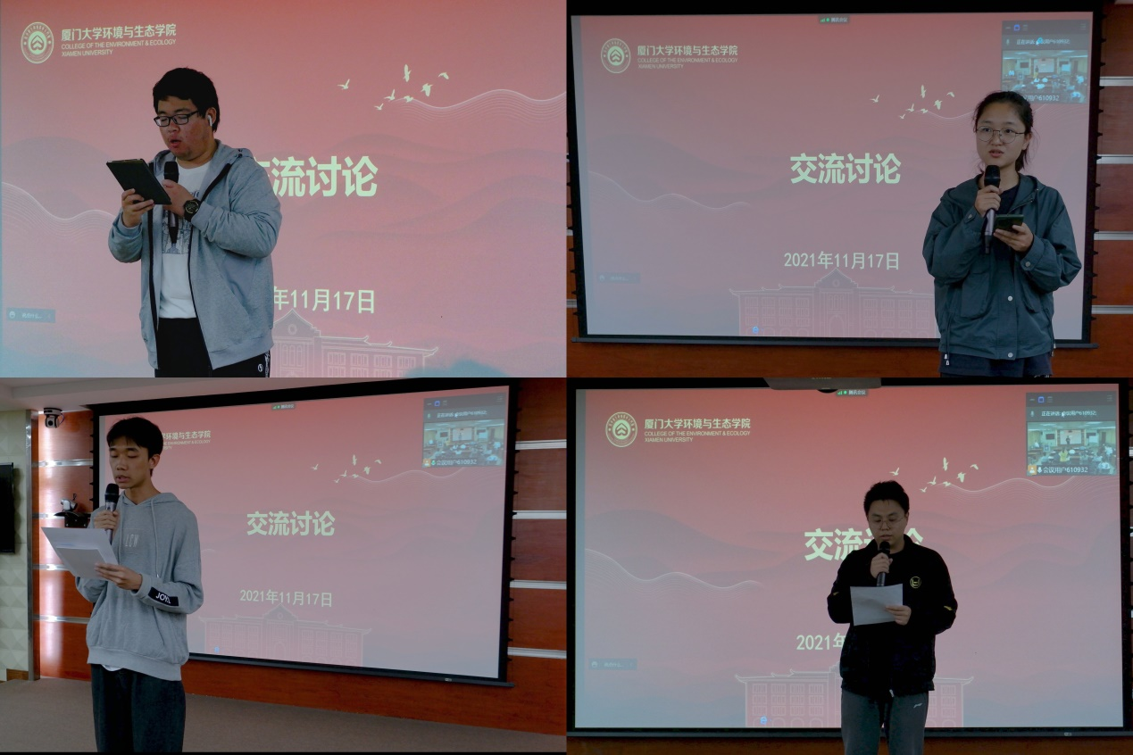 研究生团总支书记苏健阐述了自己的看法。他指出,中国特色社会主义进入了新的时代,必须坚持以人民为中心的发展思想,坚持绿水青山就是金山银山的发展观念。作为环生学子,也是新时代环境生态学科发展的推动者、建设者,不仅要从六中全会精神中汲取智慧和力量,更需要回顾中国共产党在历史和实践中遇到的艰难险阻,团结一心、顽强奋斗,为开辟中国共产党领导下的“绿水青山建设”提供学科视角和思想力量。