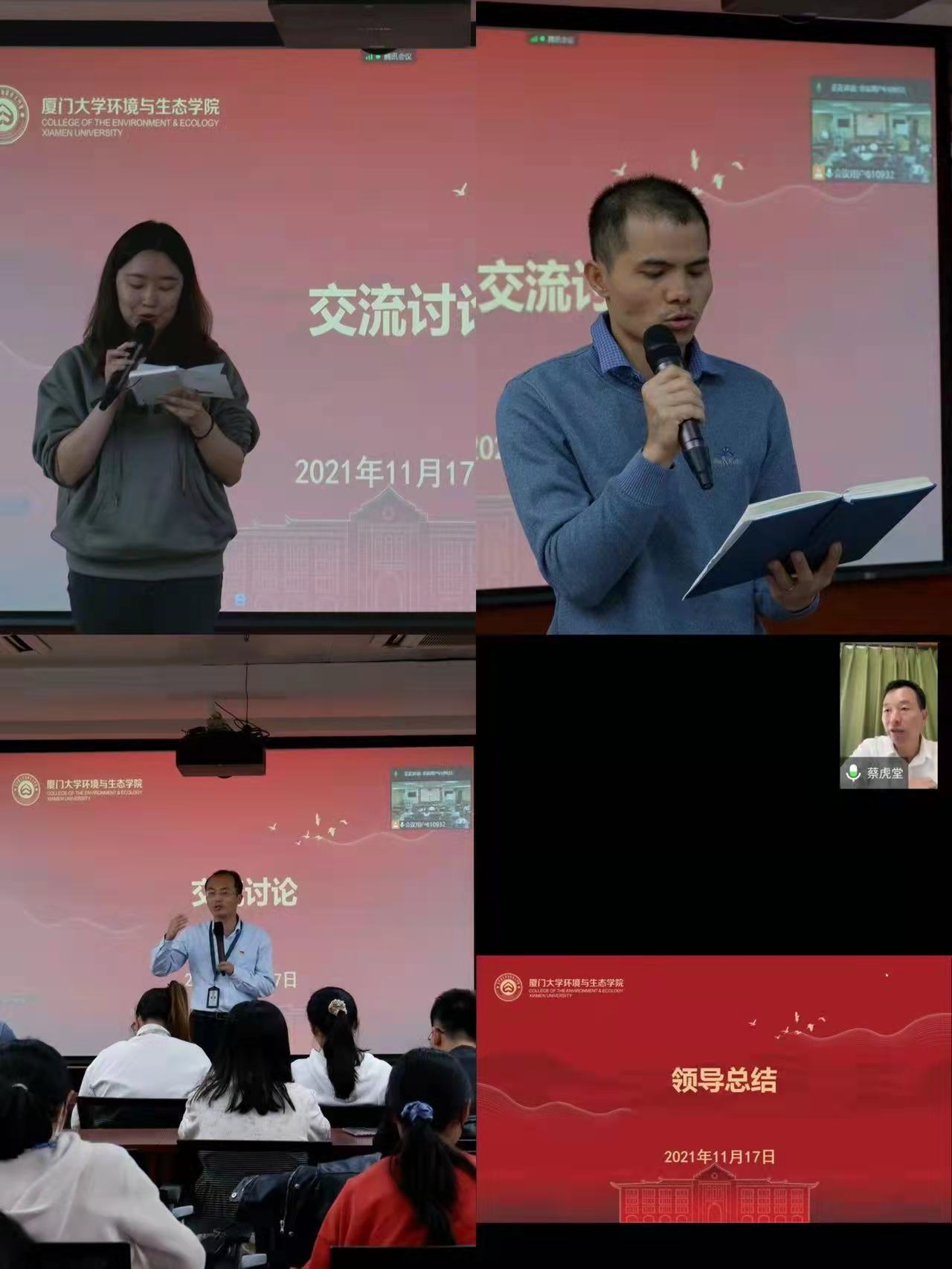 因在思明校区参加学校会议,蔡虎堂线上参加会议并总结发言。他强调,第一,应在思想上充分认识到十九届六中全会的重要历史意义。十九届六中全会是党在重要历史关头召开的重要历史会议,会议最重要的成果通过的《中共中央关于党的百年奋斗重大成就和历史经验的决议》是一篇光辉的马克思主义纲领,是新时代中国共产党人牢记初心使命、坚持和发展中国特色社会主义的共同宣言,是以史为鉴、开创未来、实现中华民族伟大复兴的行动指南;第二,各党团支部、学生组织应结合学院的党团活动月活动开展相关活动,以党团日、“三会一课”等为载体,创造性地开展符合青年特点的系列学习活动,把学习全会精神融入到同学们的日常学习生活中去;第三,环生青年要努力成为学习六中全会精神的生力军,要延续刚刚参加的校体育运动会劲头,在学习全会的“精神运动会”上取得好成绩,不断深入学习贯彻并积极宣传六中全会精神,坚定理想信念,汲取精神力量。