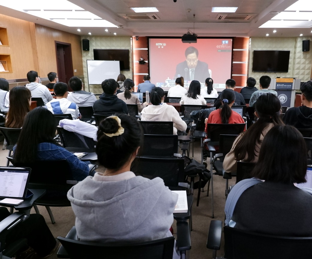 学生会执行主席高悦皓首先发言。他回顾党的百年奋斗史,指出我们要在坚持马克思主义基本原理的基础上,以更宽广的视野、更长远的眼光思考和把握国家未来发展面临的一系列重大战略问题。