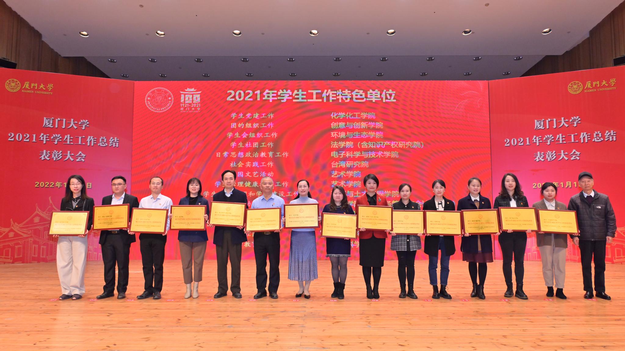 1月15日,厦门大学2021年学生工作总结表彰大会在科学艺术中心举行。大会对2021年学生工作先进单位、特色单位和先进个人进行表彰。在学生会组织工作项目特色工作考评中,我院喜获厦门大学2021年学生工作特色单位称号。