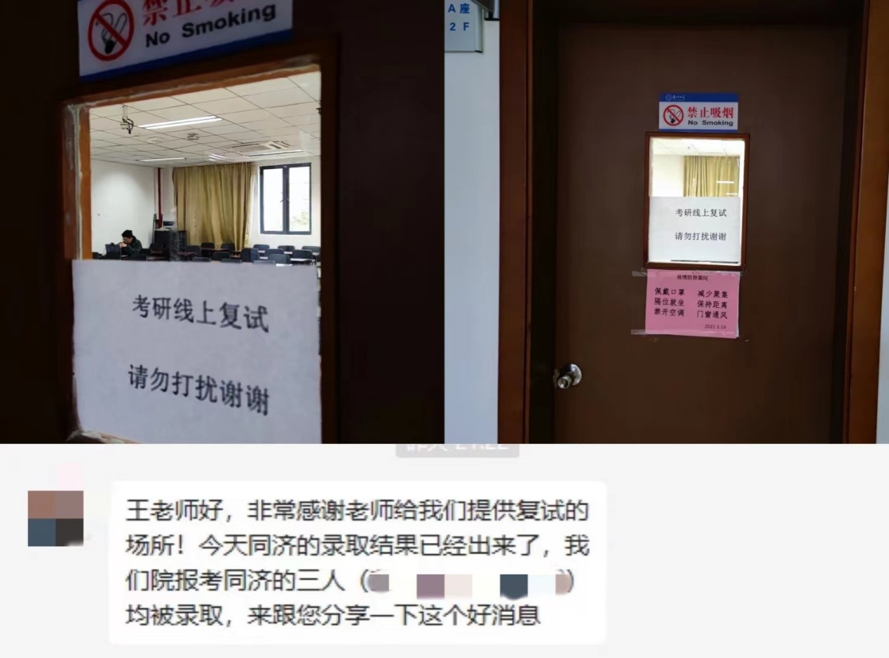 走访过程中了解到,由于疫情突发,部分学生难以找到合适的场所,进行线上研究生复试和招聘面试。得知情况后,学院学工组立刻统筹协调,腾出学院部分办公室和教室供给同学们使用。 3月22日起,累计为30余名同学解决了场地问题,帮助同学顺利完成线上复试面试。