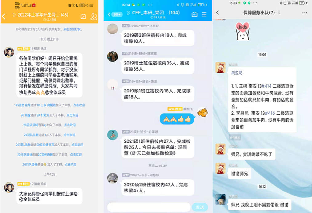 封校管理期间,蔡虎堂和辅导员分头邀请同学来学院谈心谈话,深入了解学生的思想动态,倾听学生心声,耐心进行政策引导和心理疏导,传达学校的关心和温暖,积极回应学生合理诉求,帮助排忧解难,全力解决同学遇到的各种困难,全面保障学生科研、学习、生活等各方面需求。