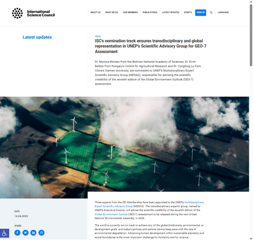 4月14日,国际科学理事会在其官网公布了由其推荐入选联合国环境规划署第七版《全球环境展望》报告(GEO-7)的多学科专家科学咨询组(MESAG)的专家名单。国际科学理事会会士、太平洋科学协会主席吕永龙教授入选。另外两位专家分别为来自玻利维亚国家科学院的Monica Moraes博士和匈牙利农业研究中心的Ervin Balázs博士。该咨询组将负责评估第七版《全球环境展望》(GEO-7)的科学可信度。